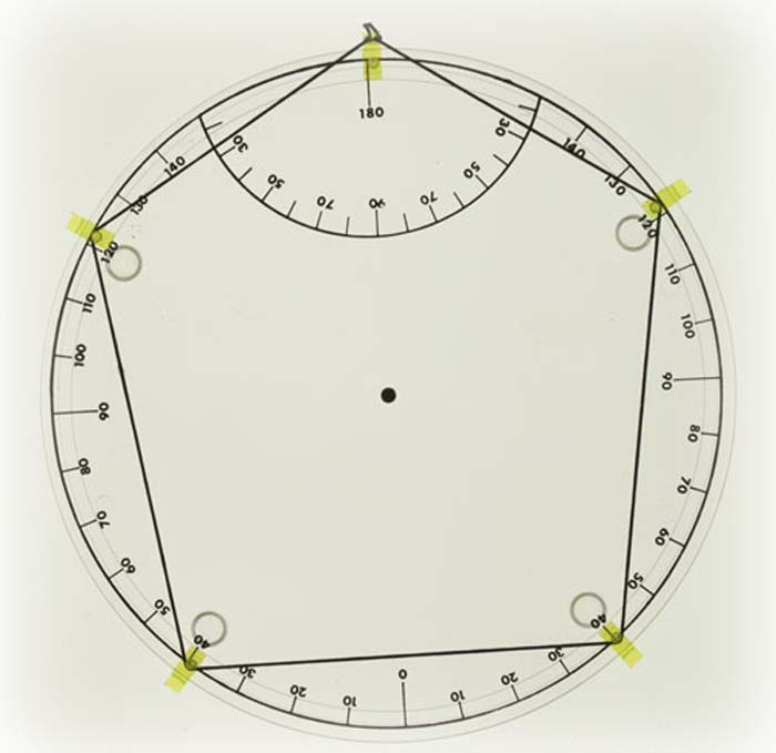 Kreismodell mit Gummifäden und beweglichen Halterungen am Kreisrand und mit Winkelteilung.