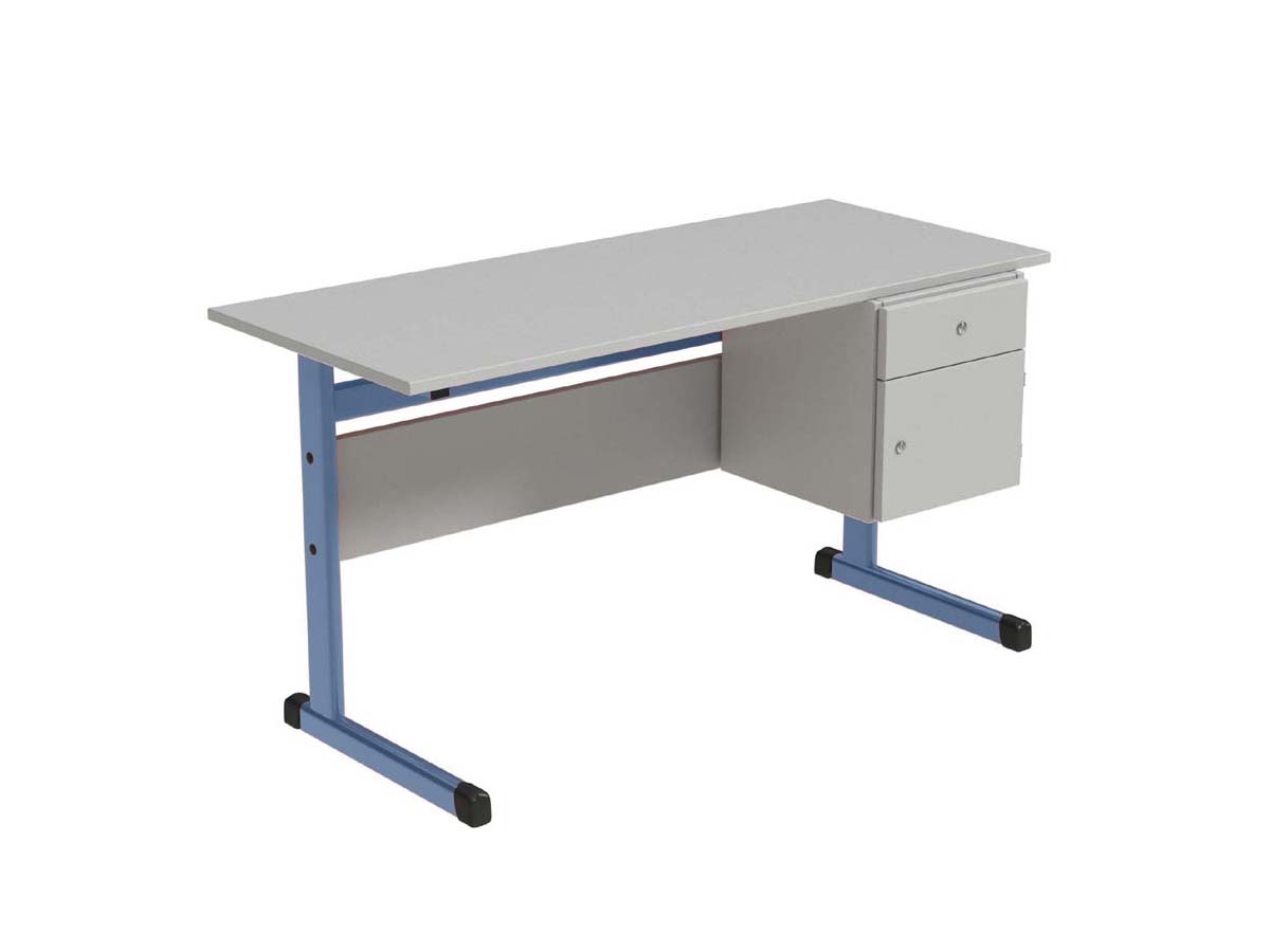 Die Tischplatten sind Standard melaminharzbeschichtet mit ABS-Kante in Buche oder Grau.