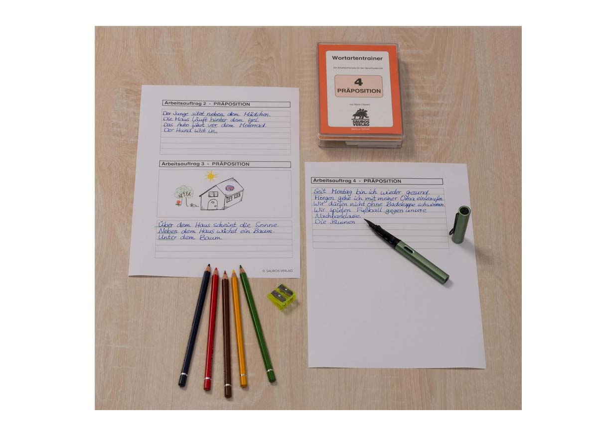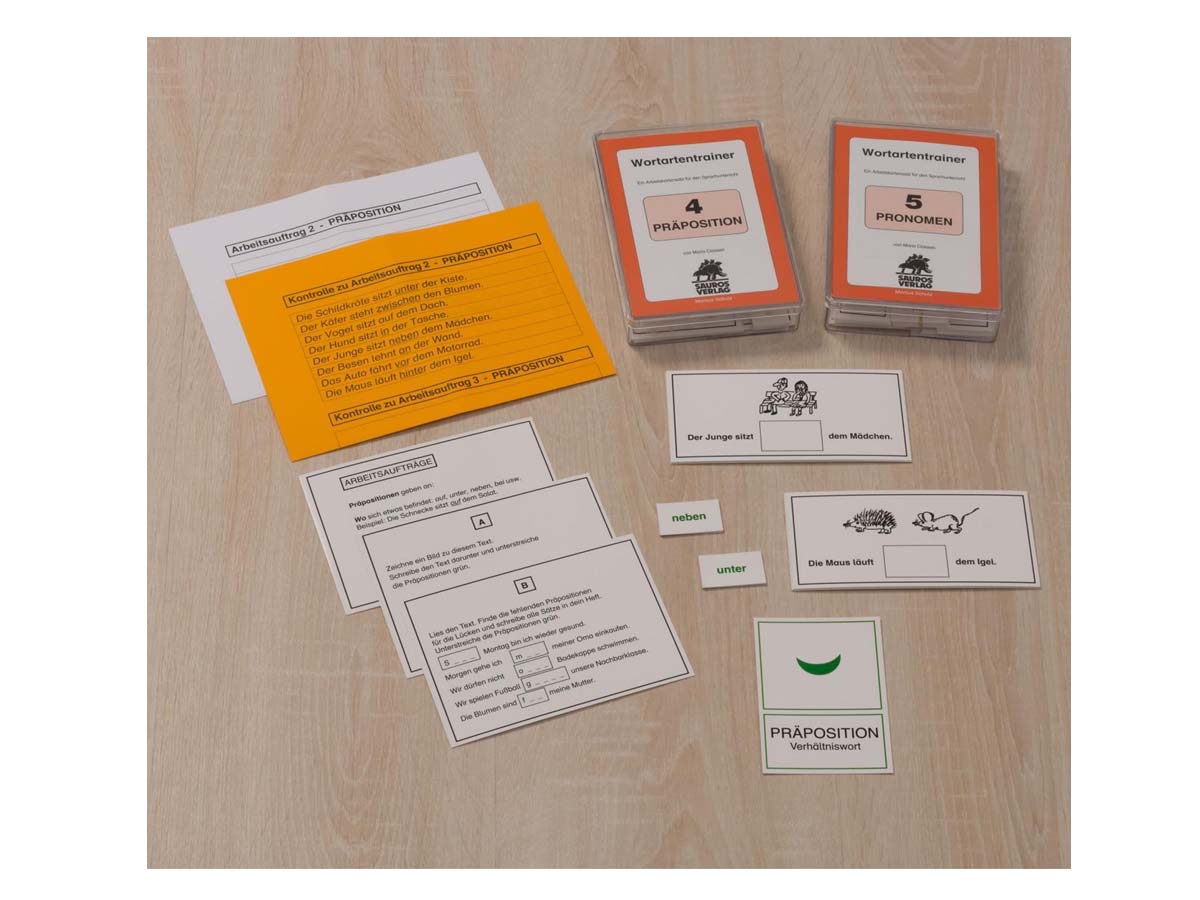 Mit den Wortartentrainern lernen die Kinder die unterschiedlichen Funktionen der Wortarten und die dadurch gegebenen Regelhaftigkeiten handelnd kennen. Präposition und Pronomen gehören zu den Wortarten, die die Schüler/Innen bis zum Ende ihrer Grundschulzeit bewusst handhaben, unterscheiden und mit dem Fachterminus benennen können sollen.