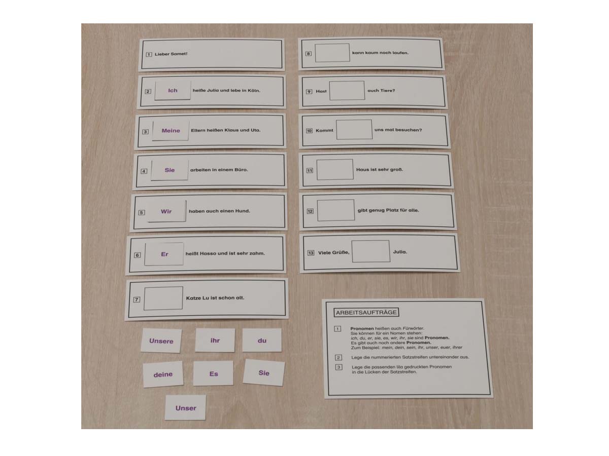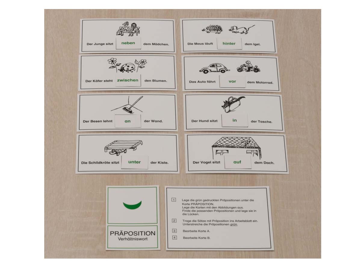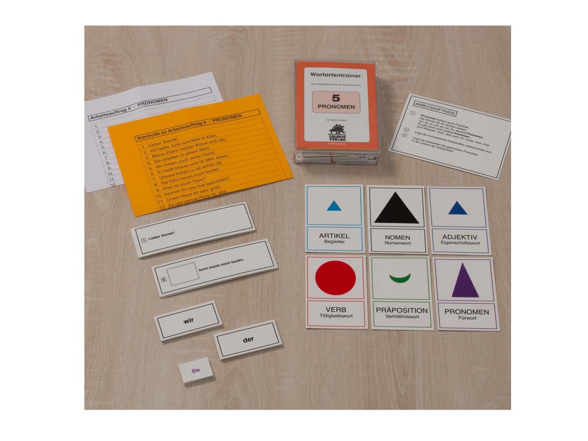 Jede Dose konzentriert sich auf eine Wortart. Mit dem Material „Präposition“ erarbeiten die Schüler anschaulich die lokale Funktion. Das Material „Pronomen“ veranschaulicht insbesondere das Personalpronomen in seiner Funktion als Stellvertreter eines Nomens.