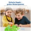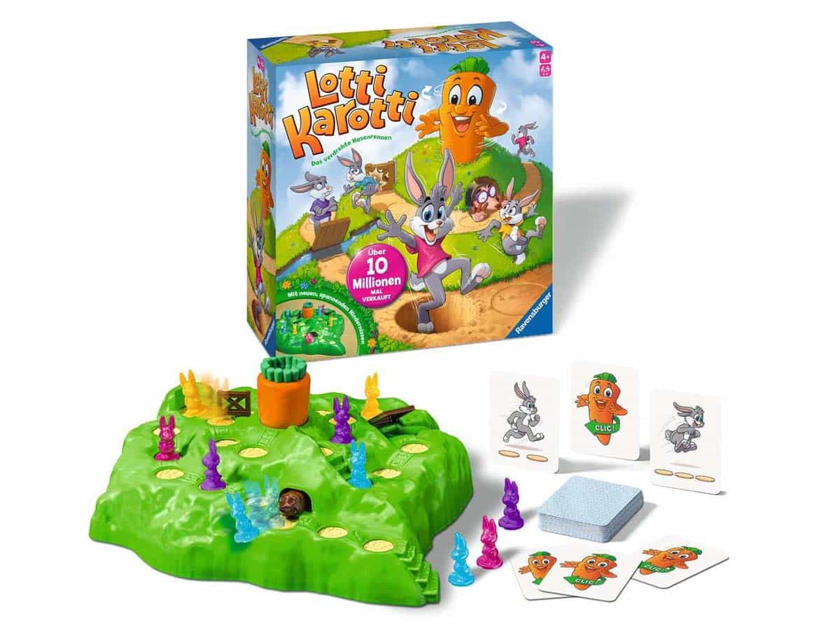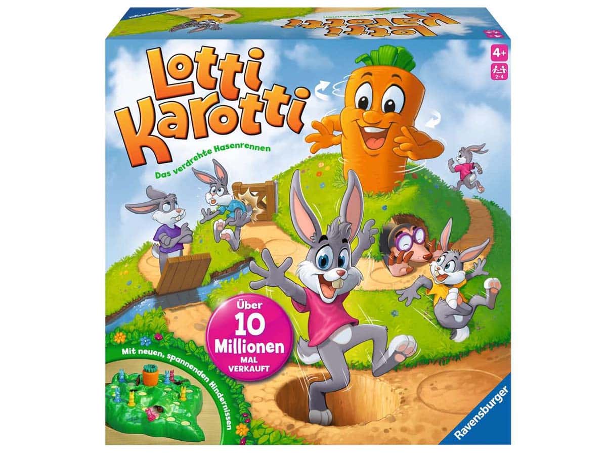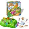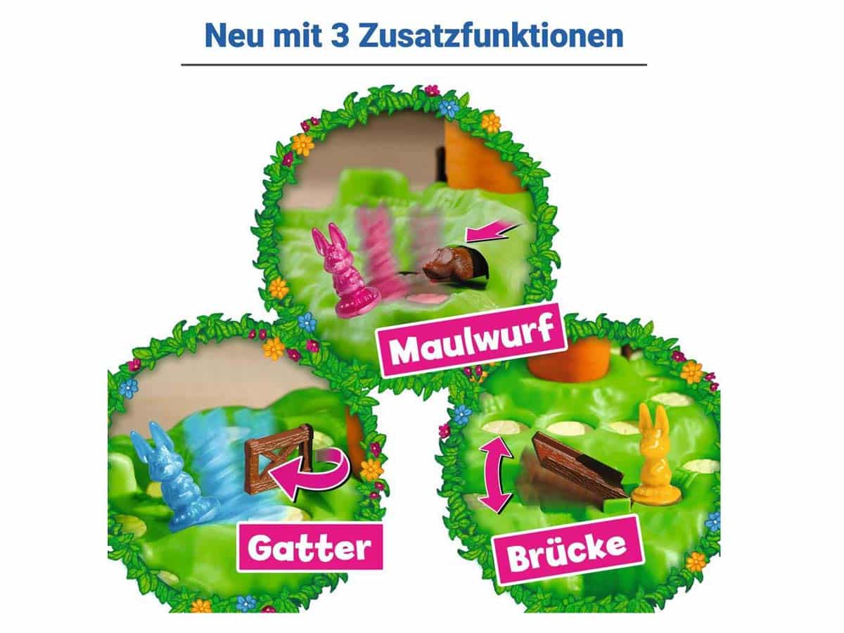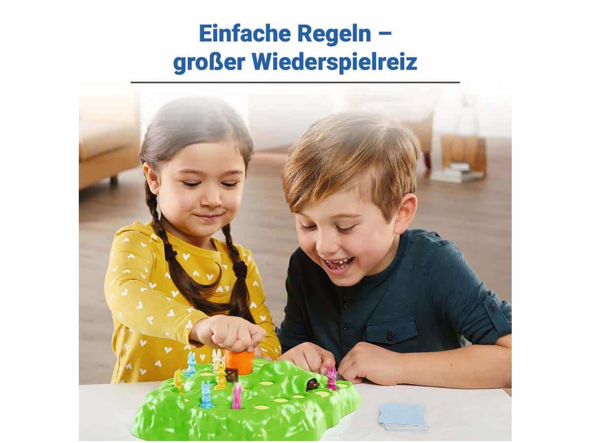 Ein lustiges Brettspiel für Klein und Groß! Dieses Spiel ab 4 Jahren ist ein großer Spaß für die ganze Familie: Die Spieler decken Karten auf, um mit ihren Hasen den Berg hinauf zu hüpfen – Wer als erstes mit seinem Hasen bei der Karotte ankommt, hat gewonnen. Die Karten geben an, wie schnell der Hase laufen darf. Aber Vorsicht der Weg dorthin ist voller Überraschungen. Wer die Karottenkarte zieht, darf an der großen Karotte auf dem Hügel drehen und sorgt damit für Löcher auf dem grünen Hügel – und plumps, fällt der eine oder andere Hase hinein.