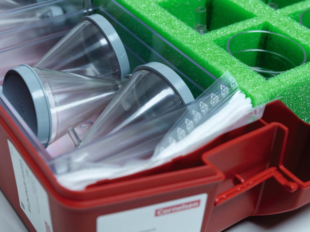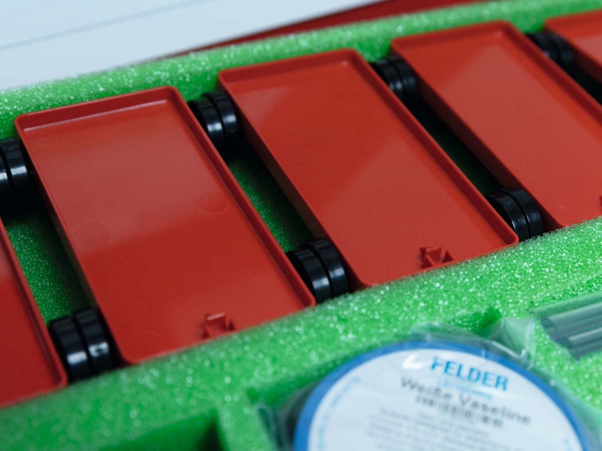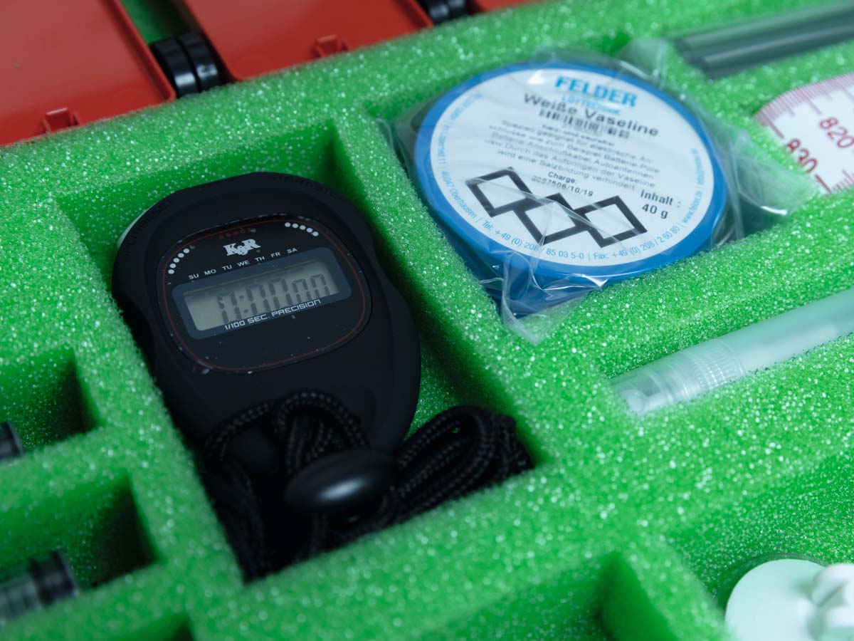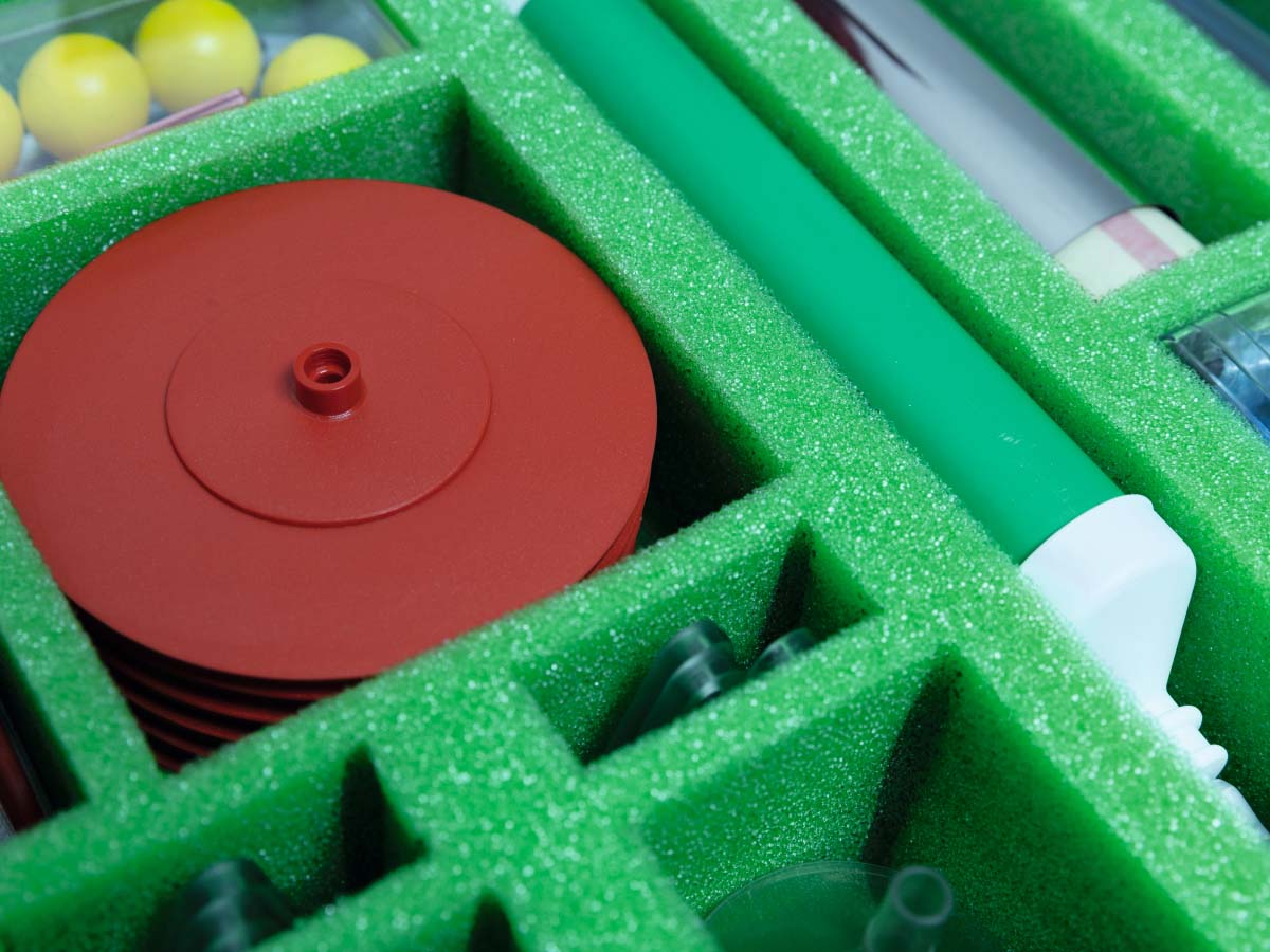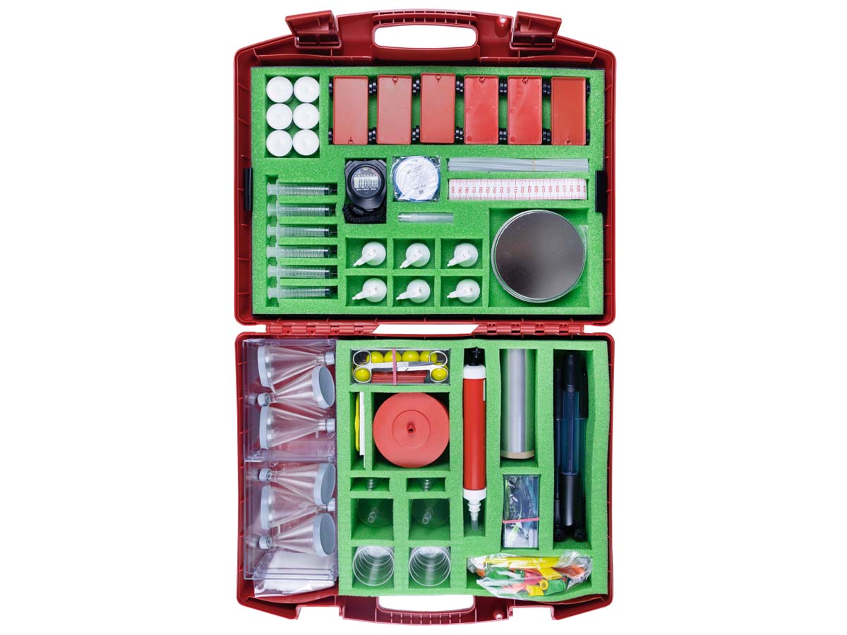 Wannen, transparent – Saugflaschen mit abnehmbarem Boden – Trichter – Becher – Platten – Schläuche, Kunststoffrohr – Schwimmkörper – Luftballons mit verstärkter Oberflächenspannung – Luftballonventile, Ballpumpe – Rückstoßwagen mit Ventilgabel – Luftkissenplatte – Luftpumpen, Zylinder transparent – Blitzventile – Spritzen mit Schlauchansatz – Saughebelhaken – Lupen – Objektträger mit Gitterraster – Vaseline – Teelichte – Bandmaße, Scheren, Schnur, Klebeband – Stoppuhr – Fallschirme – Raketenmodell – Heißluftballon aus Spezialfolie – Esbitbrenner, vernickelt mit Metallteller und Heizrohr – Esbit-Trockenbrennstoff – Zerstäuber