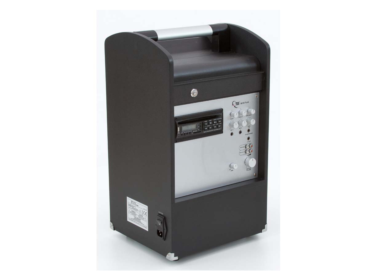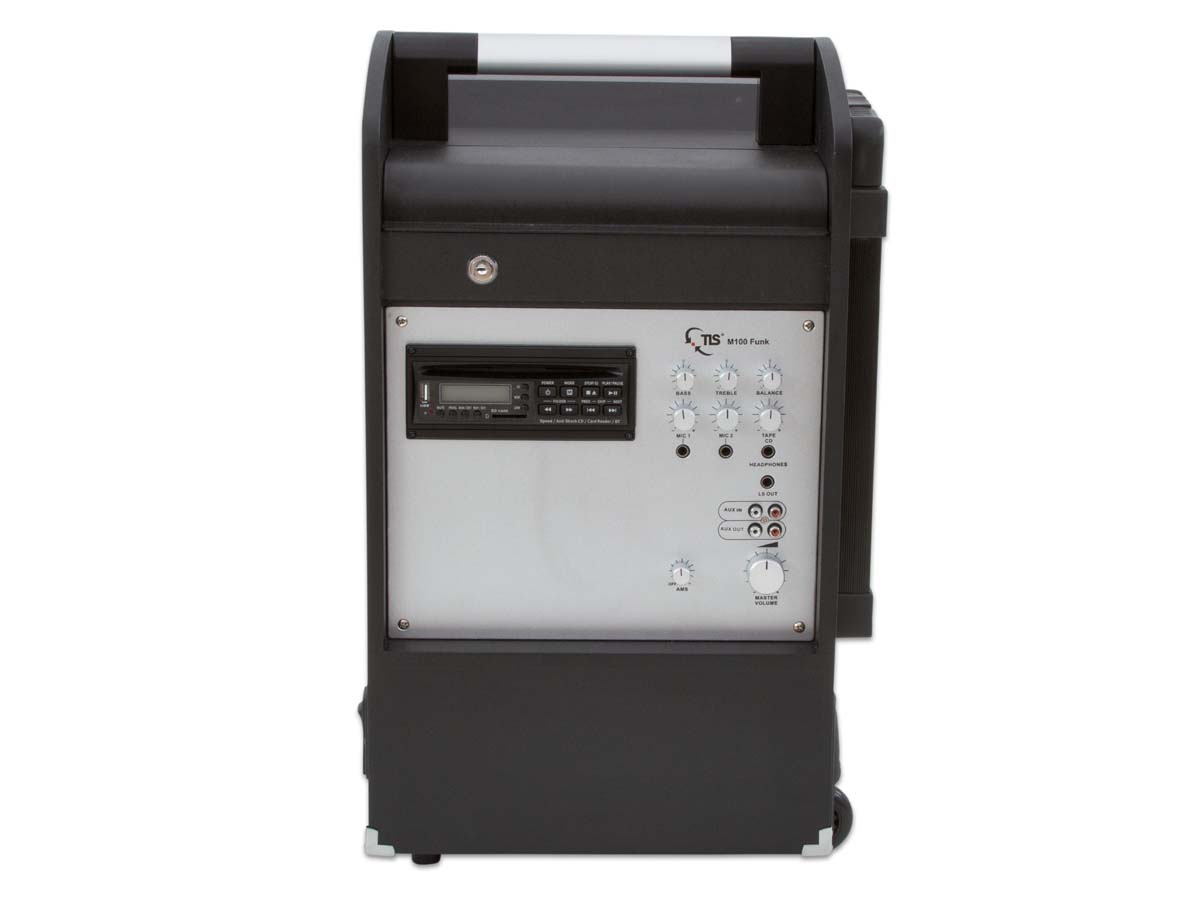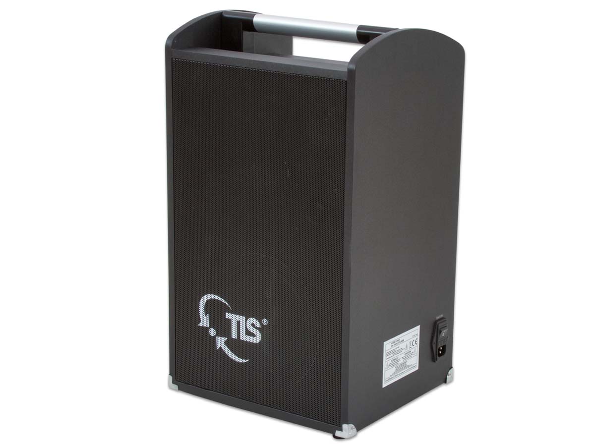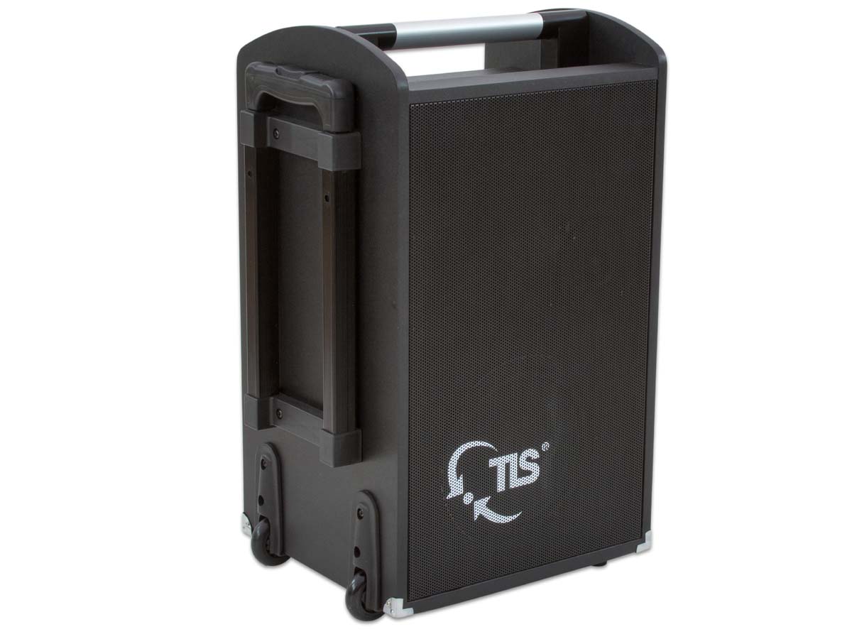 Der TLS M100 Blue ist eine TLS-Soundanlage zur idealen Nutzung in der Sporthalle, in der Aula oder für kleinere Veranstaltungen auf dem Schulhof. Mit der Fernbedienung kann der Lautsprecher während einer Rede von der sprechenden Person selbst bedient werden. Dank Trolley mit Teleskopgriff und Rollen transportieren Sie die Soundbox einfach und rückenschonend.