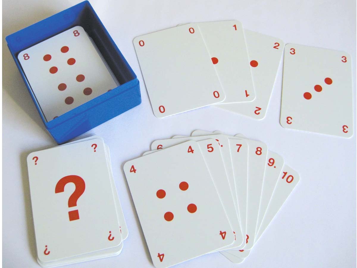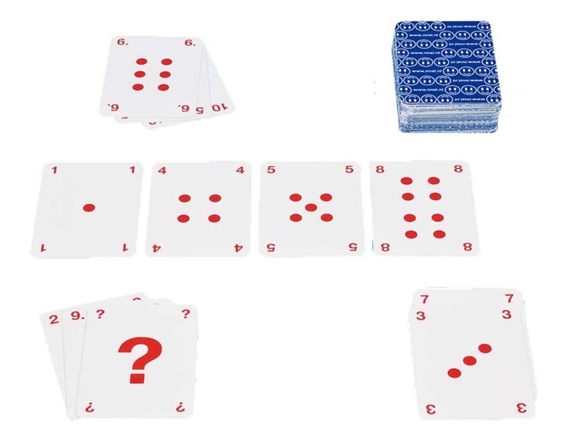 Das Spiel enthält 48 Karten die bedruckt sind mit den Zahlen und Zahlenbildern 0 bis 10 und dem Fragezeichen.