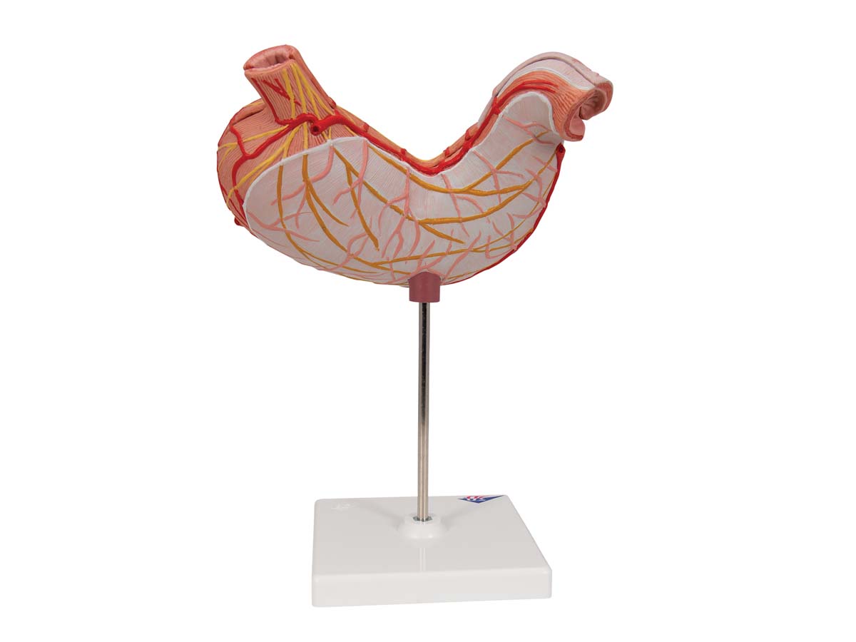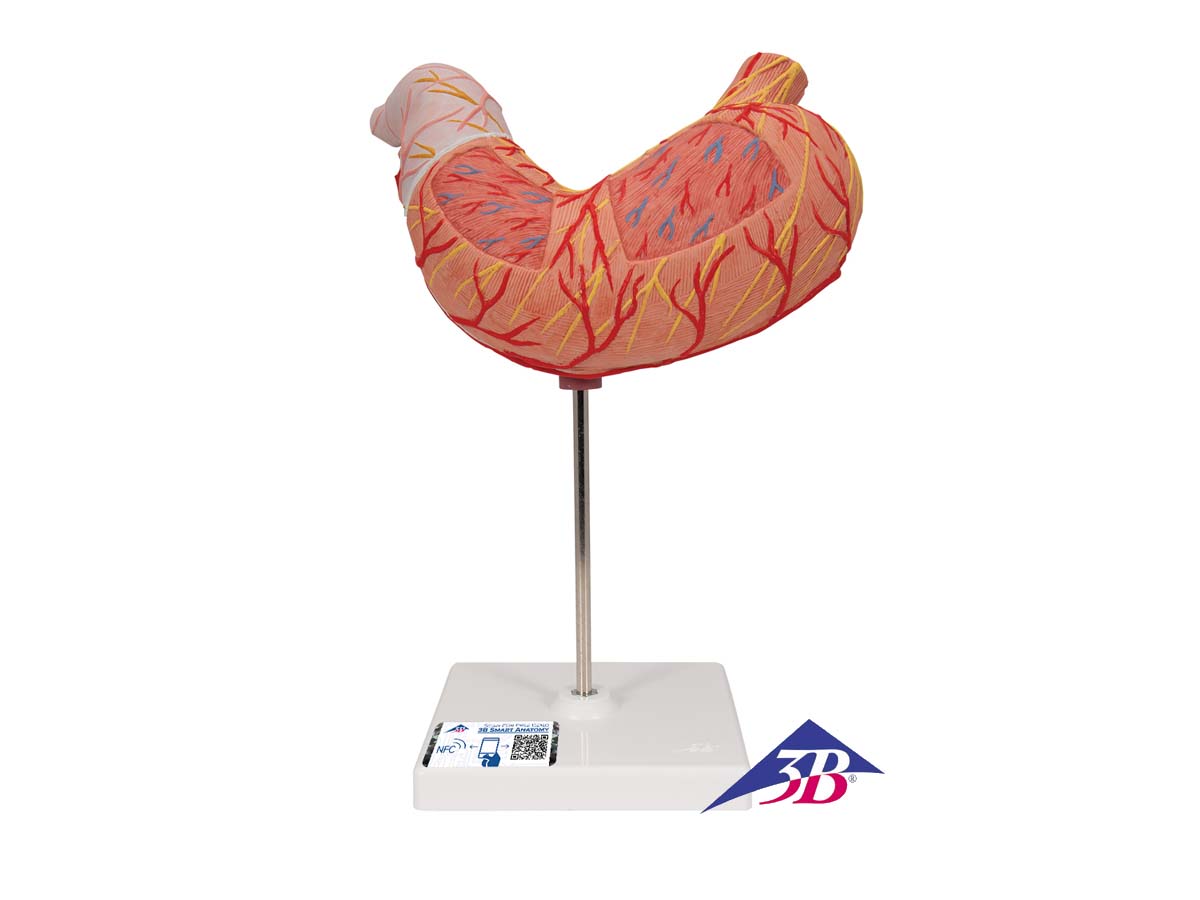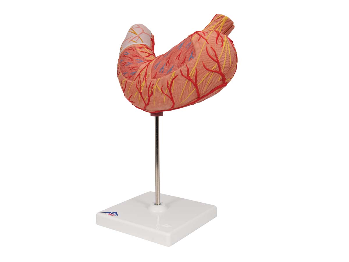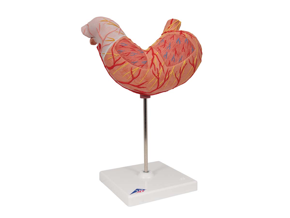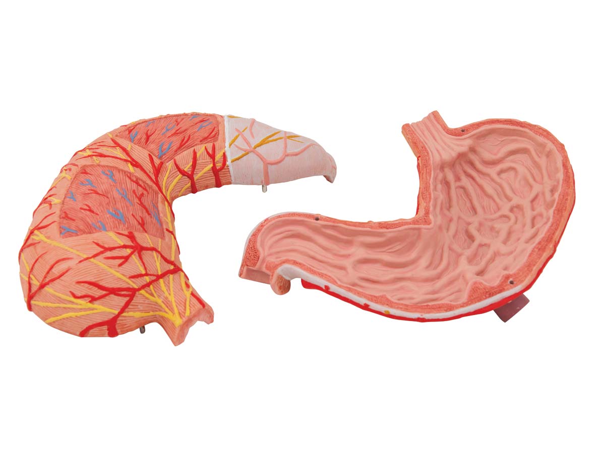 Das Modell zeigt die einzelnen Schichten der Magenwand von der Cardia bis zum Pylorus. Die vordere Magenhälfte ist abnehmbar. Dargestellt sind: