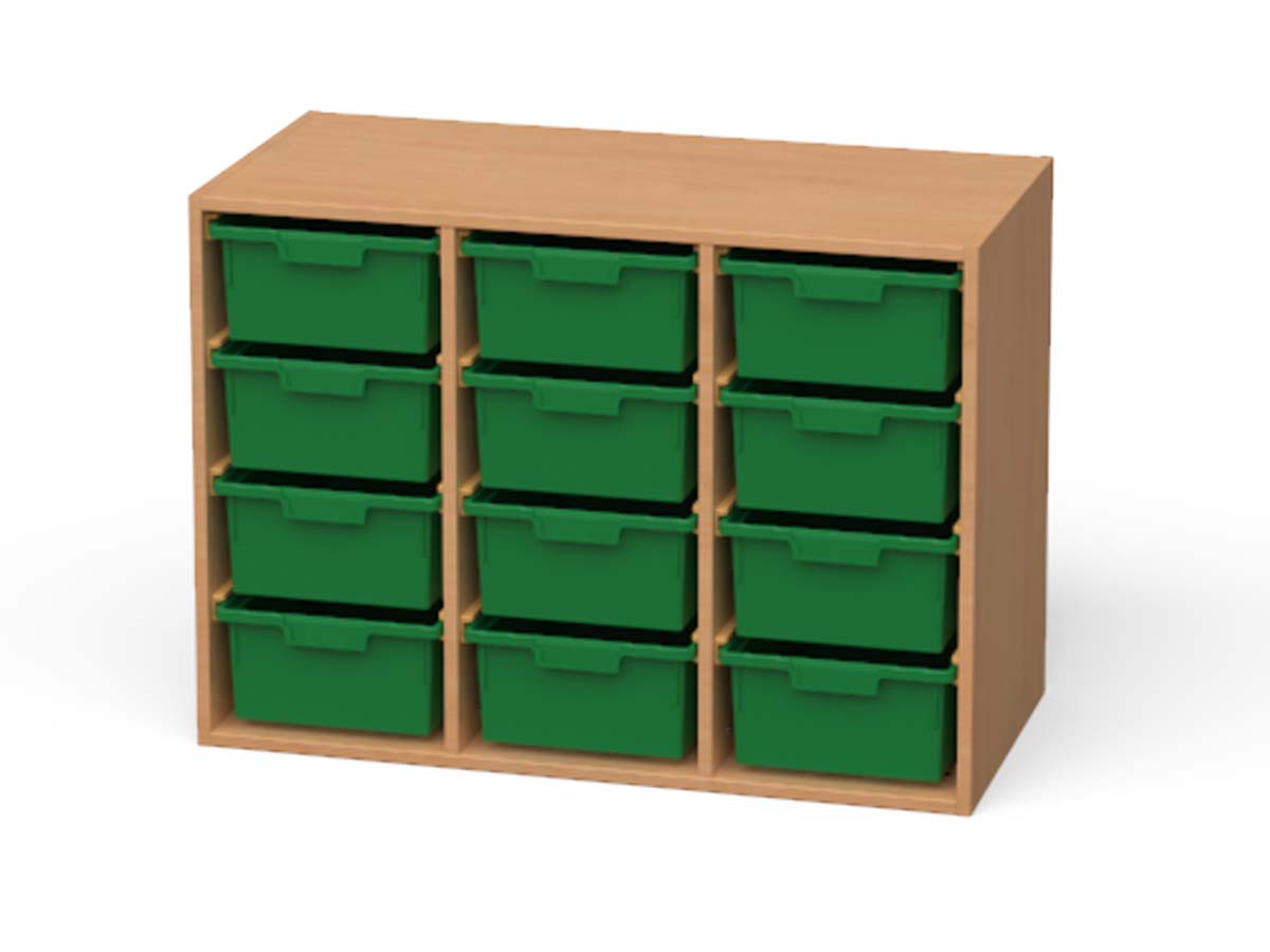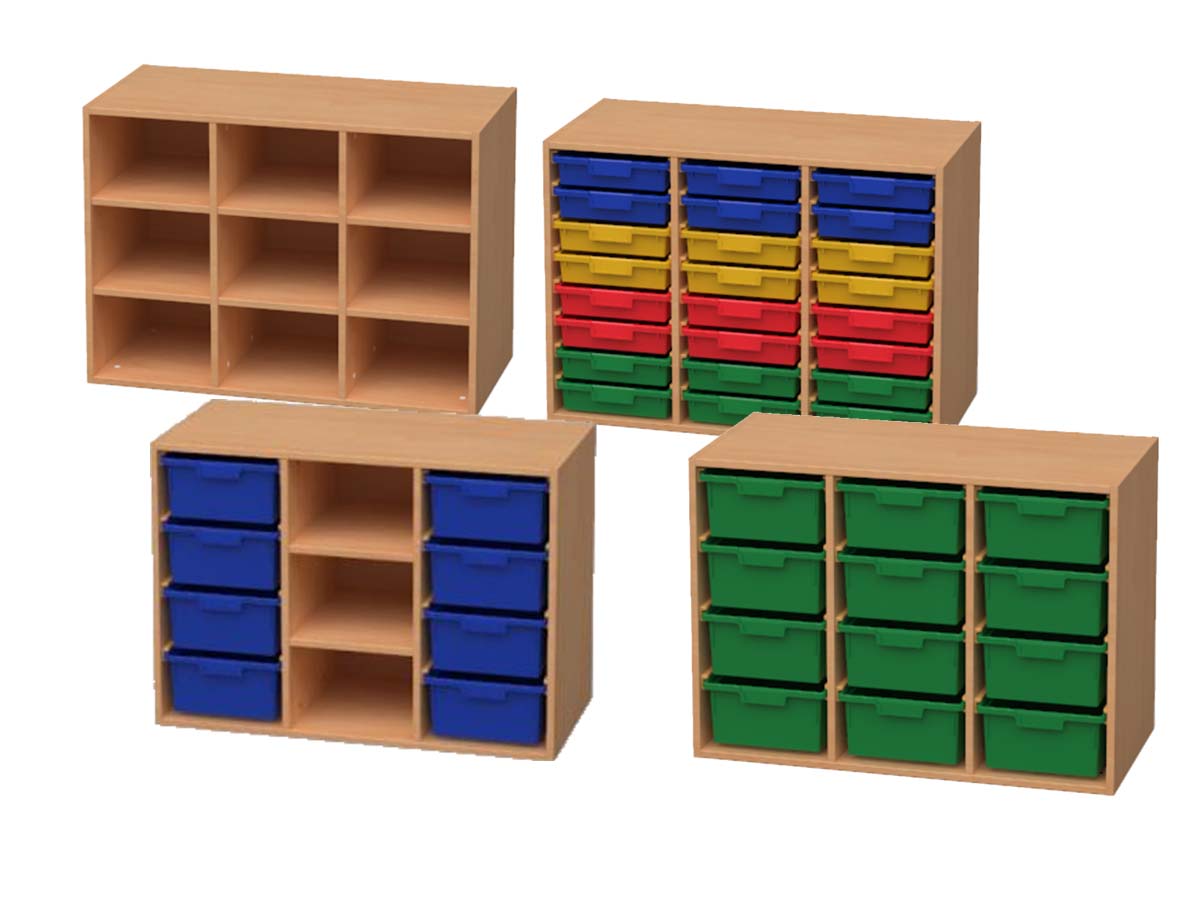 mit 12 hohen Kunststoffschüben, mit 24 flachen Kunststoffschübe, mit 4 hohen Kunststoffschüben mitte und 2 x 3 Einlegeböden, mit 8 hohen Kunststoffschüben rechts/links, 3 Einlegeböden, mit 9 Einlegeböden
