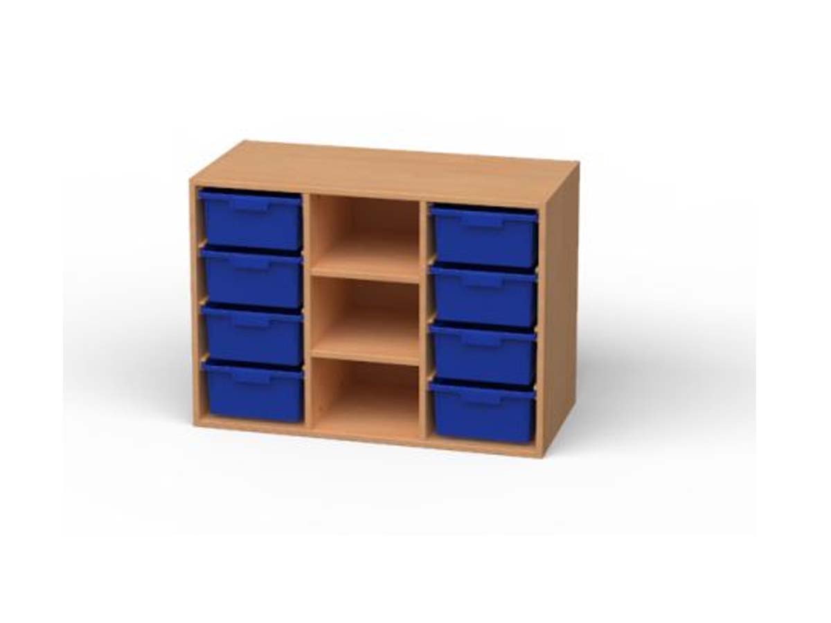 – mit 4 hohen Kunststoffschüben mitte und je 2 x 3 Einlegeböden rechts und links