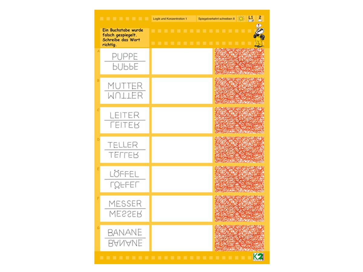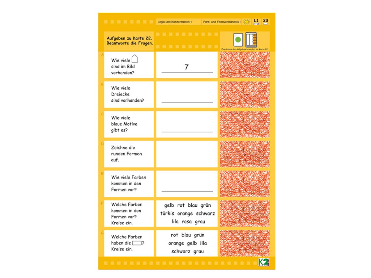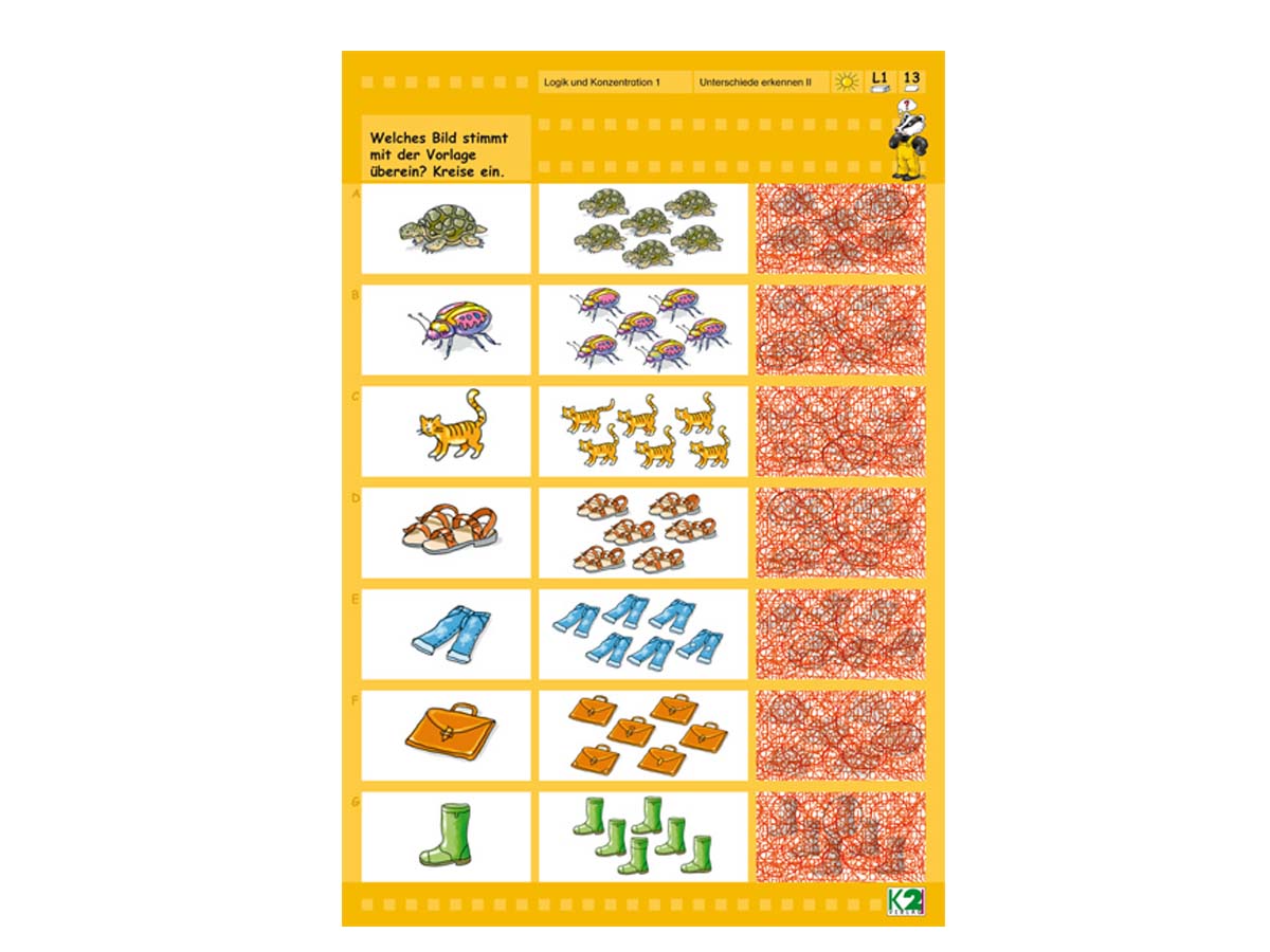 Der Bereich Konzentration beschäftigt sich vor allem mit dem Training der Ausdauer bei konzentrierter Arbeit, der Merkfähigkeit und dem Abrufen gespeicherter Inhalte.