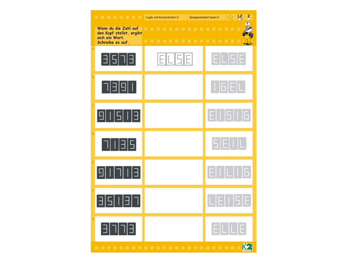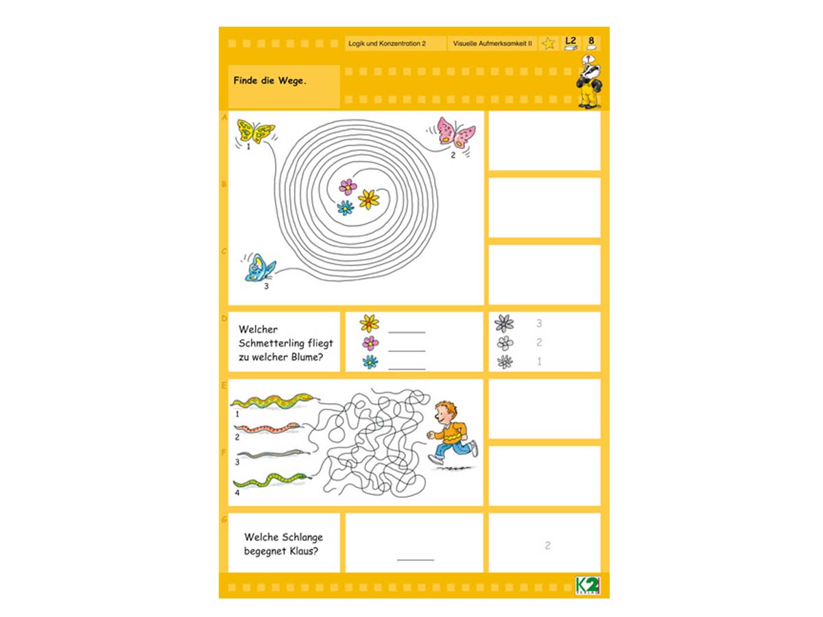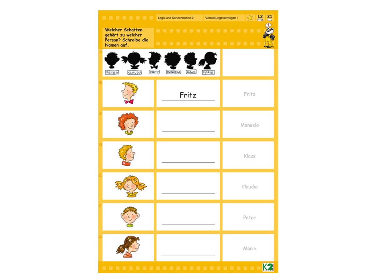 Der Bereich Konzentration beschäftigt sich vor allem mit dem Training der Ausdauer bei konzentrierter Arbeit, der Merkfähigkeit und dem Abrufen gespeicherter Inhalte.