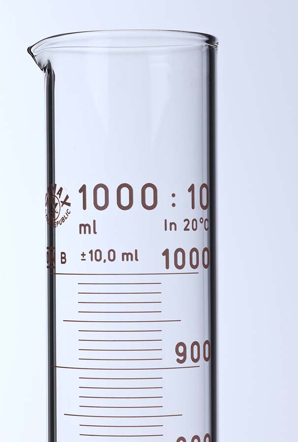 Inhalt – Teilung 25 ml – 0,5 ml 50 ml – 1,0 ml 100 ml – 1,0 ml 250 ml – 2,0 ml 500 ml – 5,0 ml 1000 ml – 10,0 ml