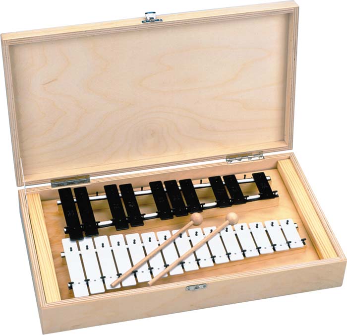 Metallophon chromatisch, 25 schwarz/weiß Klangplatten Stahl 20 x 2 mm, mit Halbtönen g2 – g4, Grundplatte aus Sperrholz, klangrein gestimmt, Rahmen auch Fichte, mit 2 Holzkugelschlägel.