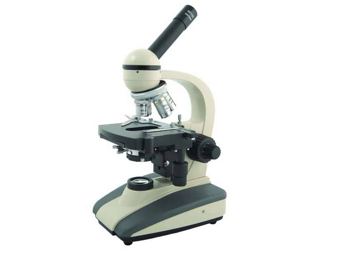Monokulares Mikroskop mit Metallstativ und koaxialem Grob- und Feintrieb.
