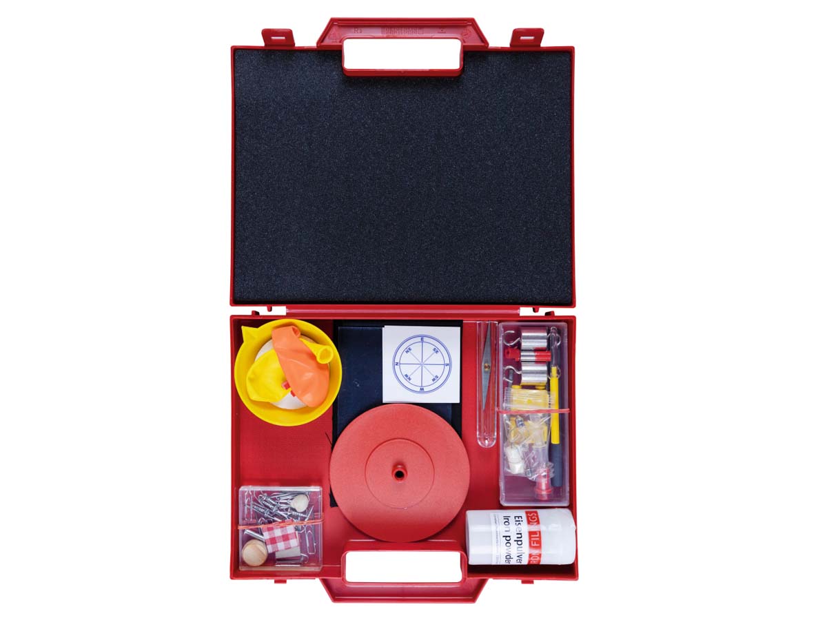 Schwimmkörper – Reiblappen, Wolle – Hakengewichte – Magnetnadel – Klammern – Luftballons – Glimmlampe – Holundermark-Doppelpendel – Klemmbuchsen – kleine Stabmagnete mit Polkennzeichnung – Metallachse – Rollwagen – Reagenzglas, Kunststoff – Ballonventil – Haltebügel – Satz Kleinmaterial – Versuchsanleitung