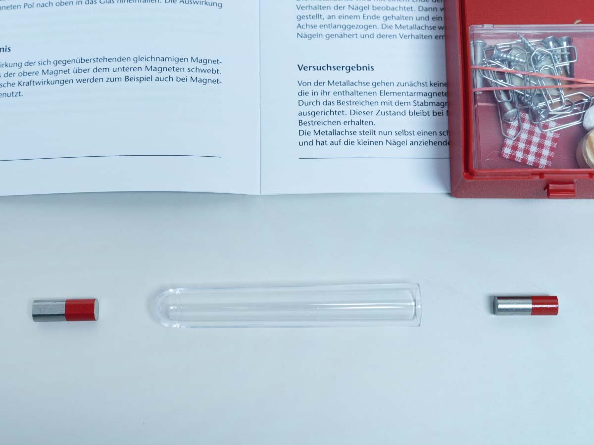 Die Box enthält eine Anleitung und 24 verschiedene Artikel u. a. eine Magnetnadel mit Halter, eine Windrose, Stabmagneten, Eisenpulver, eine Schale, Hakengewichte, Kleinmaterial und vieles mehr. Mit den Materialien dieser Box können grundlegende Experimente in den Themenbereichen Magnetismus und Elektrostatik aufgebaut werden.