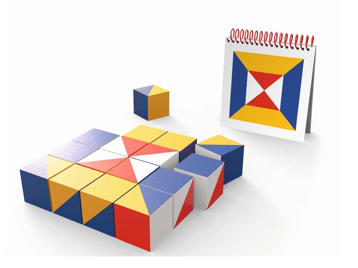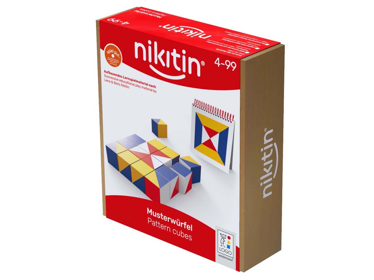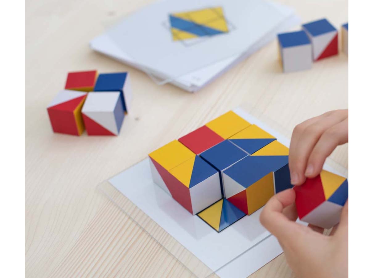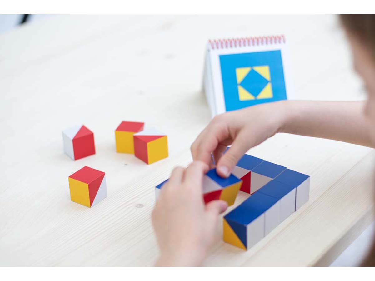 Aus den 16 Holzwürfeln mit 6 verschiedenen Farbflächen lassen sich fantastische Muster legen. Bald schon haben die Kinder den „Dreh“ heraus und erfinden viele eigene Muster. Zwei Spielvorlagenhefte führen in kleinsten Schritten zu immer neuen Erfolgserlebnissen. Das verführt einfach zum Weitermachen.