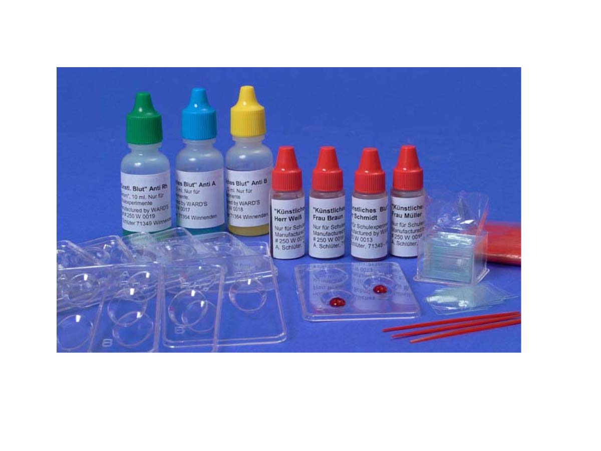 Nachfüllpackung für Experimentier-Kit de Luxe mit Rhesusfaktor: 7 Tropfflaschen „Blut“ und „Seren“.