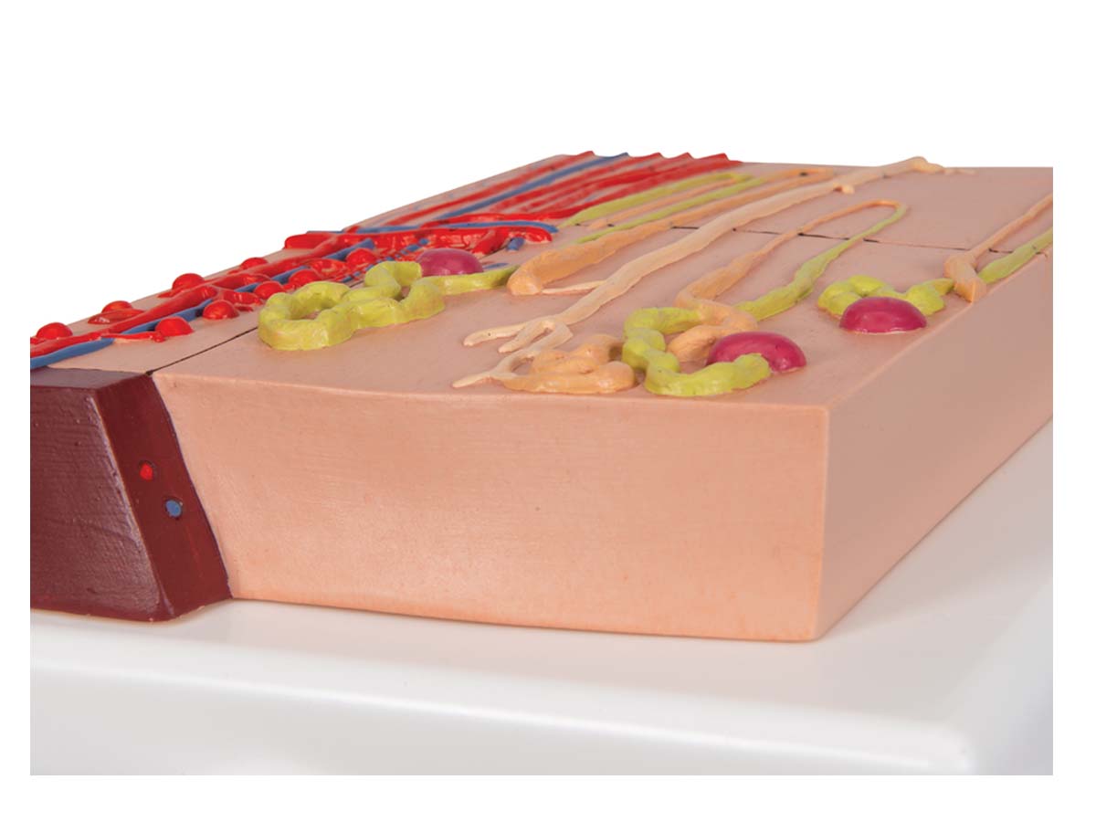 Das Nephron- und Blutgefäßmodell ist ein Nephronschnitt, der einen Schnitt durch die Nierenrinde und das Nierenmark zeigt. Das Nephronmodell zeigt die Nierenkörperchen mit den proximalen und distalen Tubuli, den Henle’schen Schleifen, den Kolletttubuli und den Blutgefäßen.