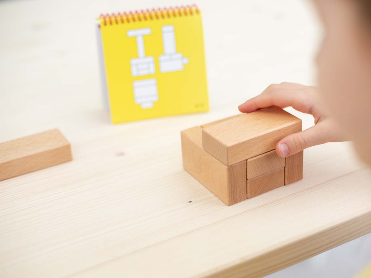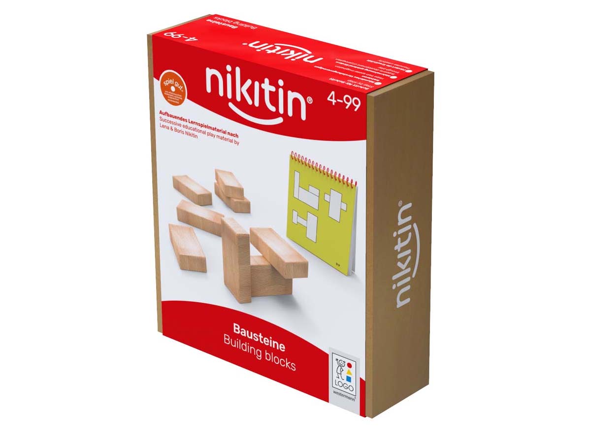 Das Spiel besteht aus 8 Holzbausteinen und einem Spielvorlagenheft mit 48 Bauplänen.