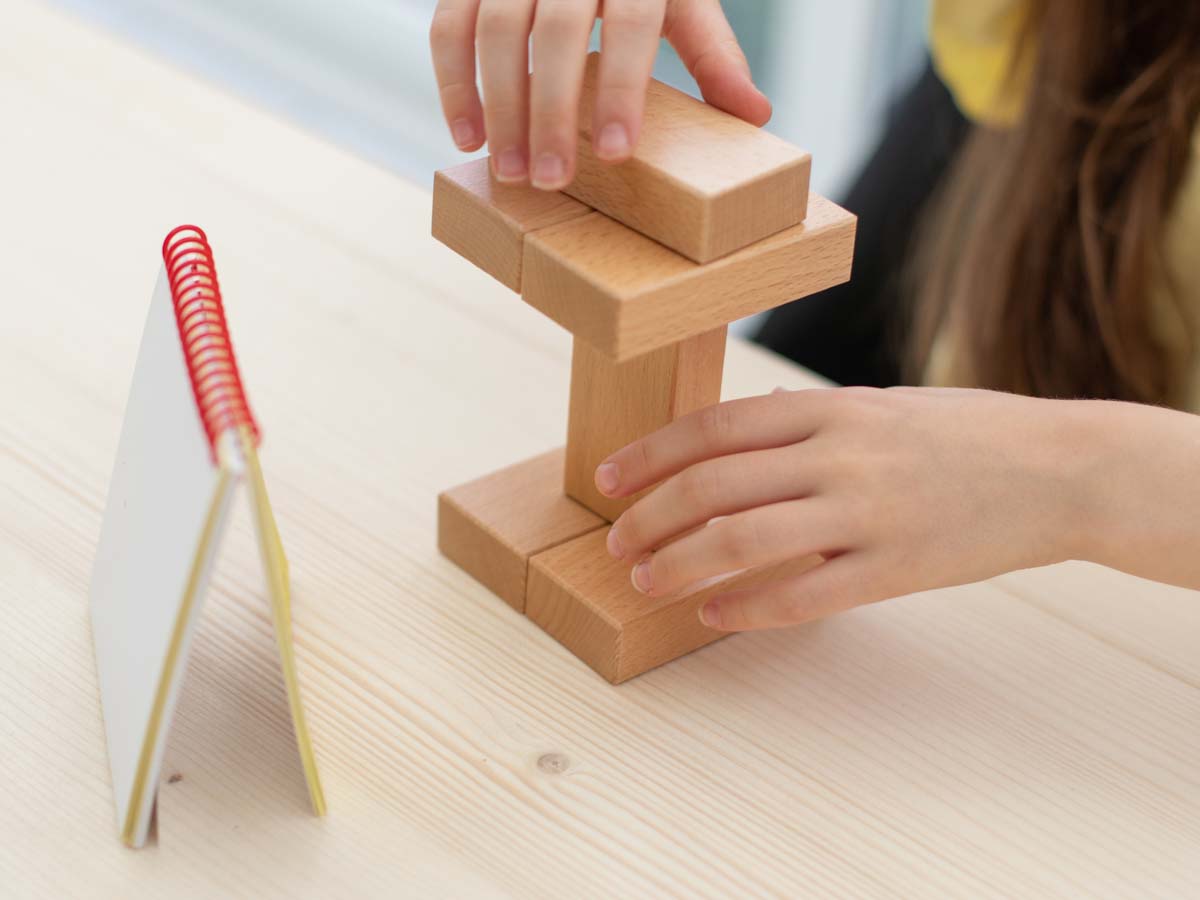 Es beginnt mit Vorlagen für zwei Bausteine und steigert sich bis zu Konstruktionen mit acht Bausteinen. Die Baupläne zeigen Ansichten von vorne, von der Seite und von oben. Es gilt, diese Ansichten mit den Bausteinen umzusetzen! Dadurch entwickelt sich das räumliche Vorstellungsvermögen und die Konzentrationsfähigkeit wird trainiert.