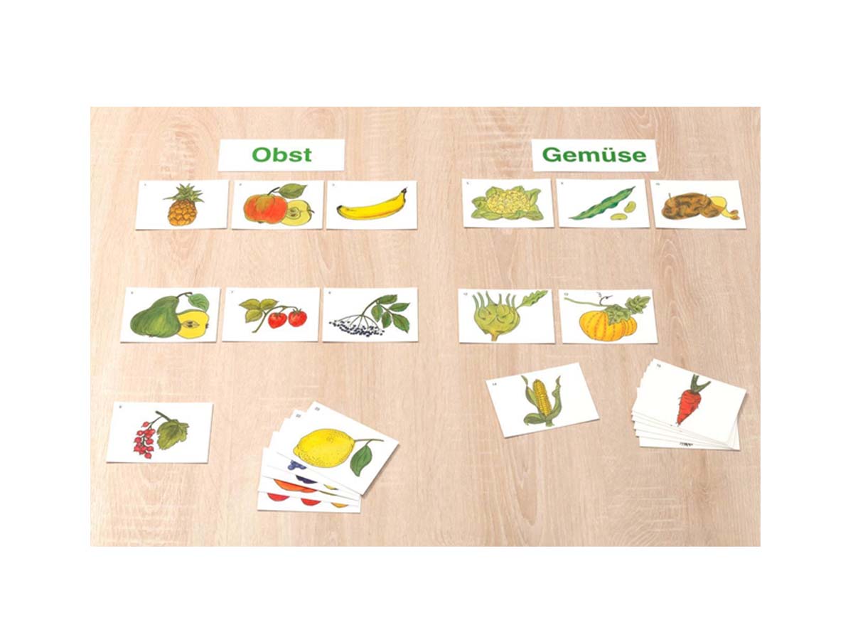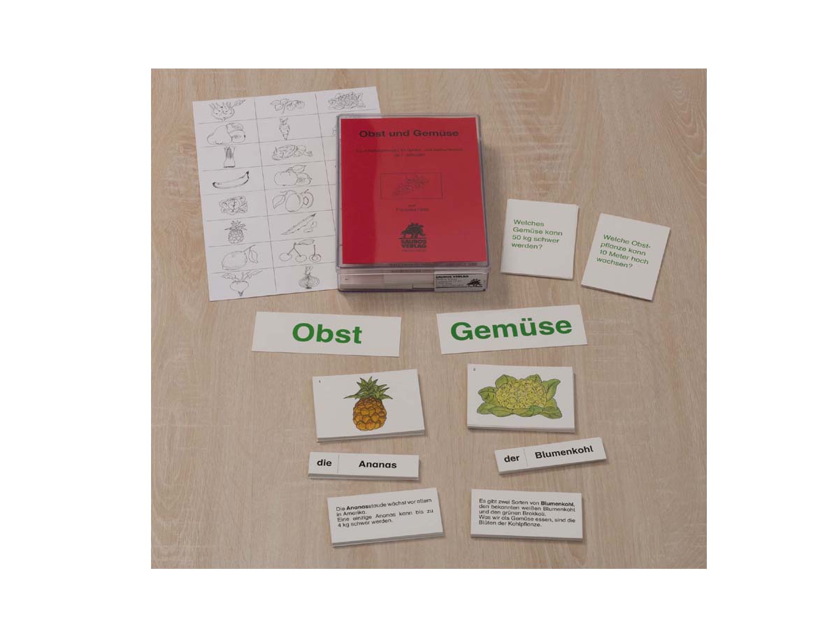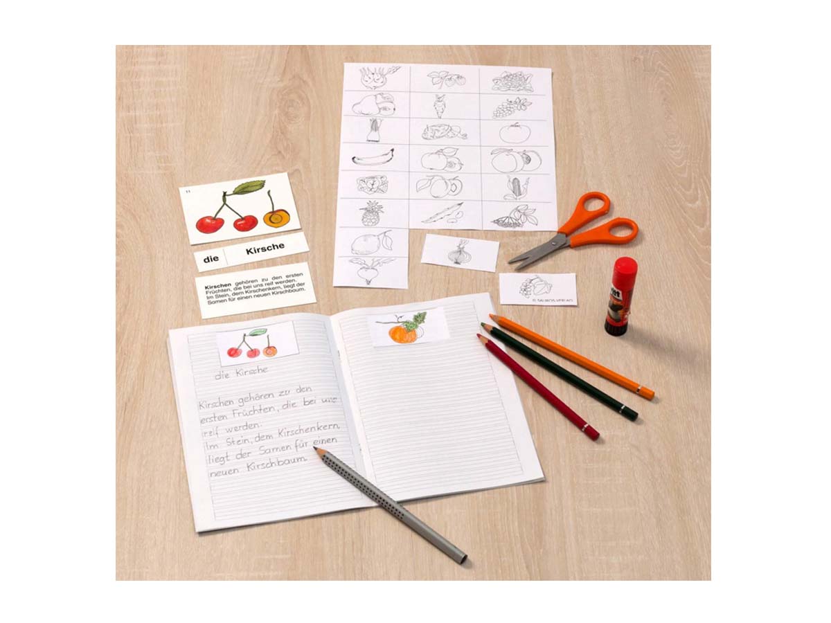Obst und Gemüse ist schon von der ersten Schulwoche an einsetzbar. Kinder, die noch nicht lesen können, sortieren die Karten zunächst und ordnen dann die einzelnen Obst- und Gemüsesorten den Titelkarten zu. Bei Schwierigkeiten hilft die Frage: „Isst du das mit Salz oder mit Zucker?“ Dann können sie das Arbeitsblatt zerschneiden und die einzelnen Zeichnungen in der vorher geschaffenen Ordnung aufkleben und anmalen.