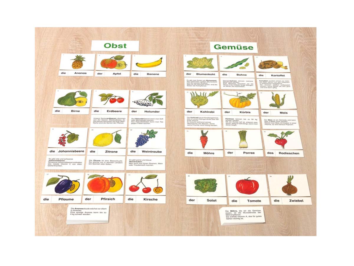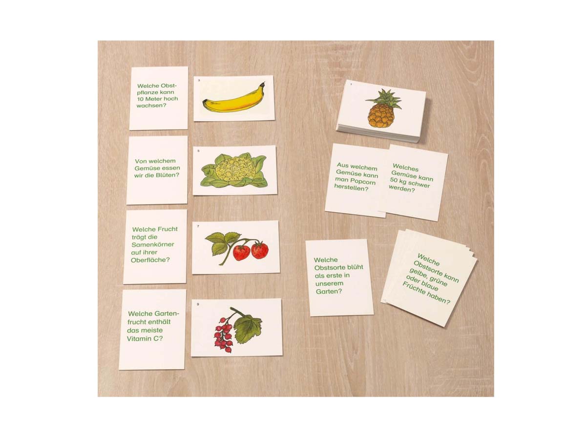 Eine motivierende Zusatzübung können die Kinder mit den in grüner Schrift gedruckten Fragekarten ausführen. Auf ihnen wird mit Textinhalten nach jeweils 6 Obst- bzw. Gemüsesorten gefragt. Die Kinder beantworten die Frage, indem sie ihr die richtige Bildkarte zuordnen. Auch hierbei können sie sich selbst kontrollieren, weil die Zahl der Bildkarte auf der Rückseite der Fragekarte aufgedruckt ist.