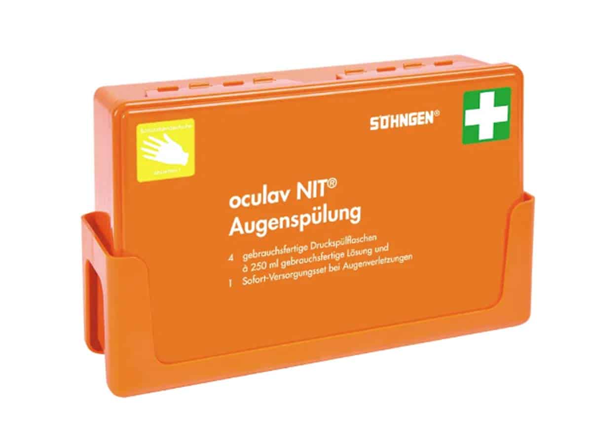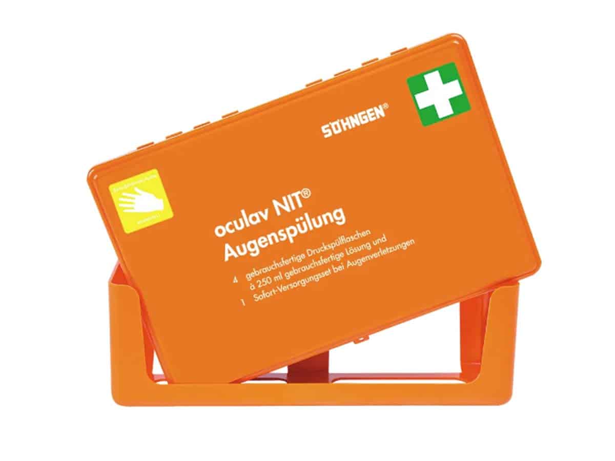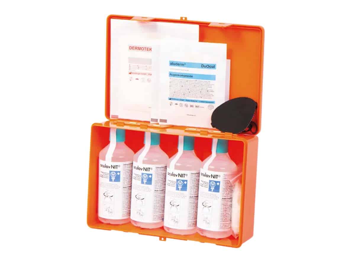 Inhalt: 4 gebrauchsfertige Druckspülflaschen, Sofortset für Augenverletzungen mit DuOcul-Augenkompressen, Augenklappe, SÖHNGEN® Silk Pflasterstreifen, DERMOTEKT® Kompresse und Einmal-Schutzhandschuhen.