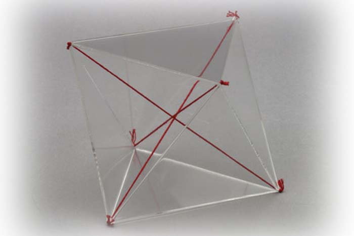 Stichworte: Mathematik - Klasse 5 bis 12, Einzelmodelle, Würfel / Polyeder, Oktaeder mit farbigen Höhenfäden, Körper