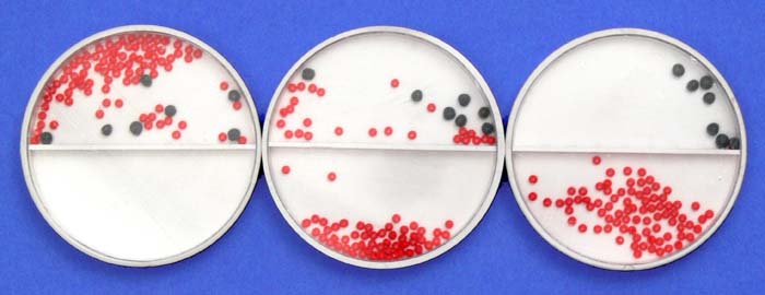 Es wird die Nachahmung der Brownschen Molekularbewegung demonstriert. Anstelle kleiner Wassermoneküle, die durch eine semipermeable Zellmembran treten finden durch Schüttelbewegungen kleine Perlen Durchlaß durch eine feingelöcherte Trennwand. Die größeren Perlen, Salzmoleküle darstellend, werden jedoch am Durchtritt verhindert. Eine Sättigung der Subkonzentration tritt ein, wenn die „Wassermoleküle“ auf beiden Seiten der „Membran“ in gleicher Konzentration vorhanden sind. Erhöhter osmotischer Druck.