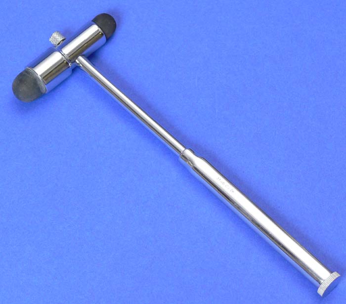 Aus Gummi mit verchromtem Griff. Zur Demonstration des Kniescheiben- (Patella-) und des Achillessehnen-Reflexes.