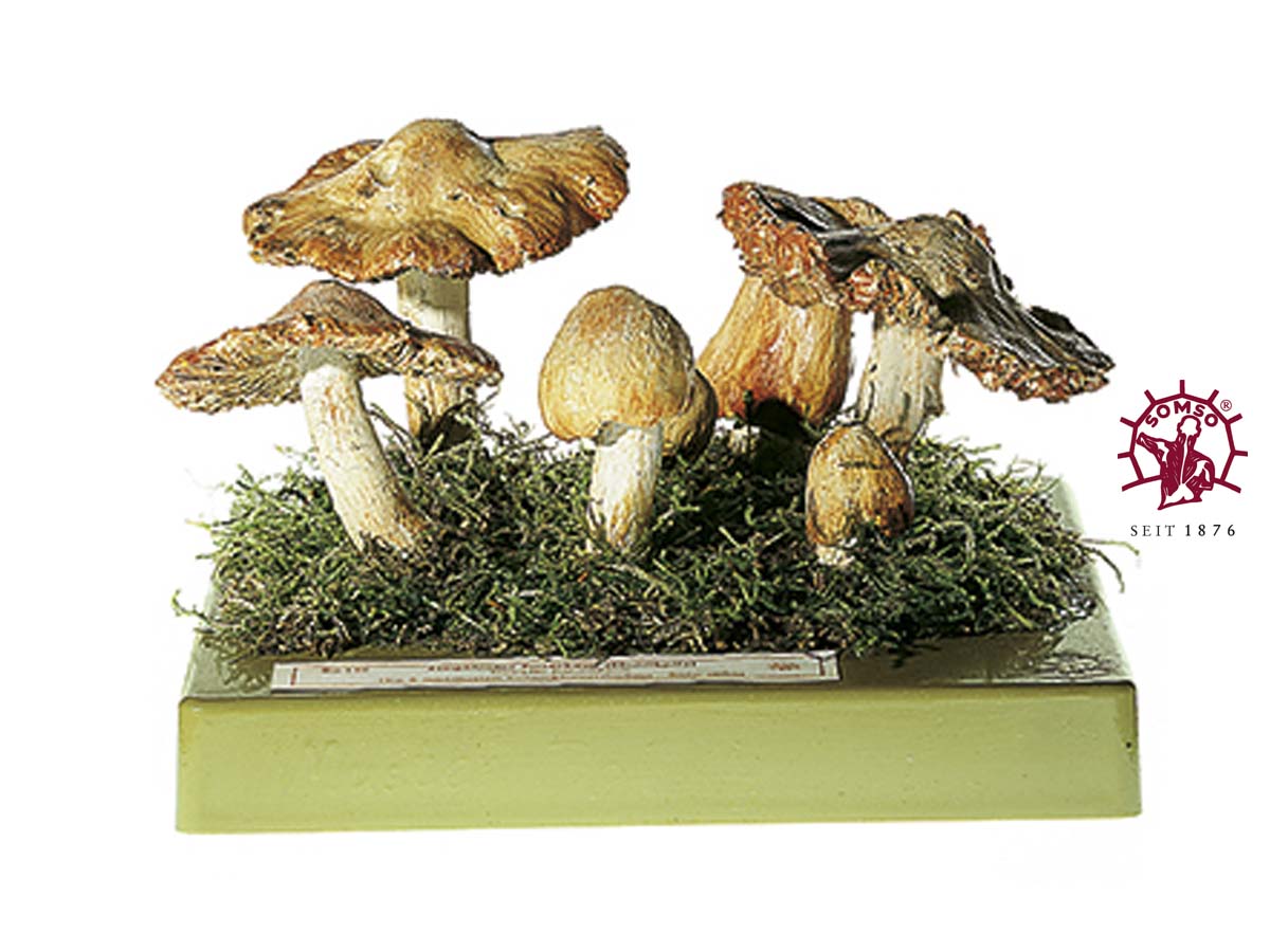 – täuschend naturgetreu bemalt – beschriftet – Ziegelroter Risspilz als Entwicklungsgruppe mit den sechs wichtigsten Stadien