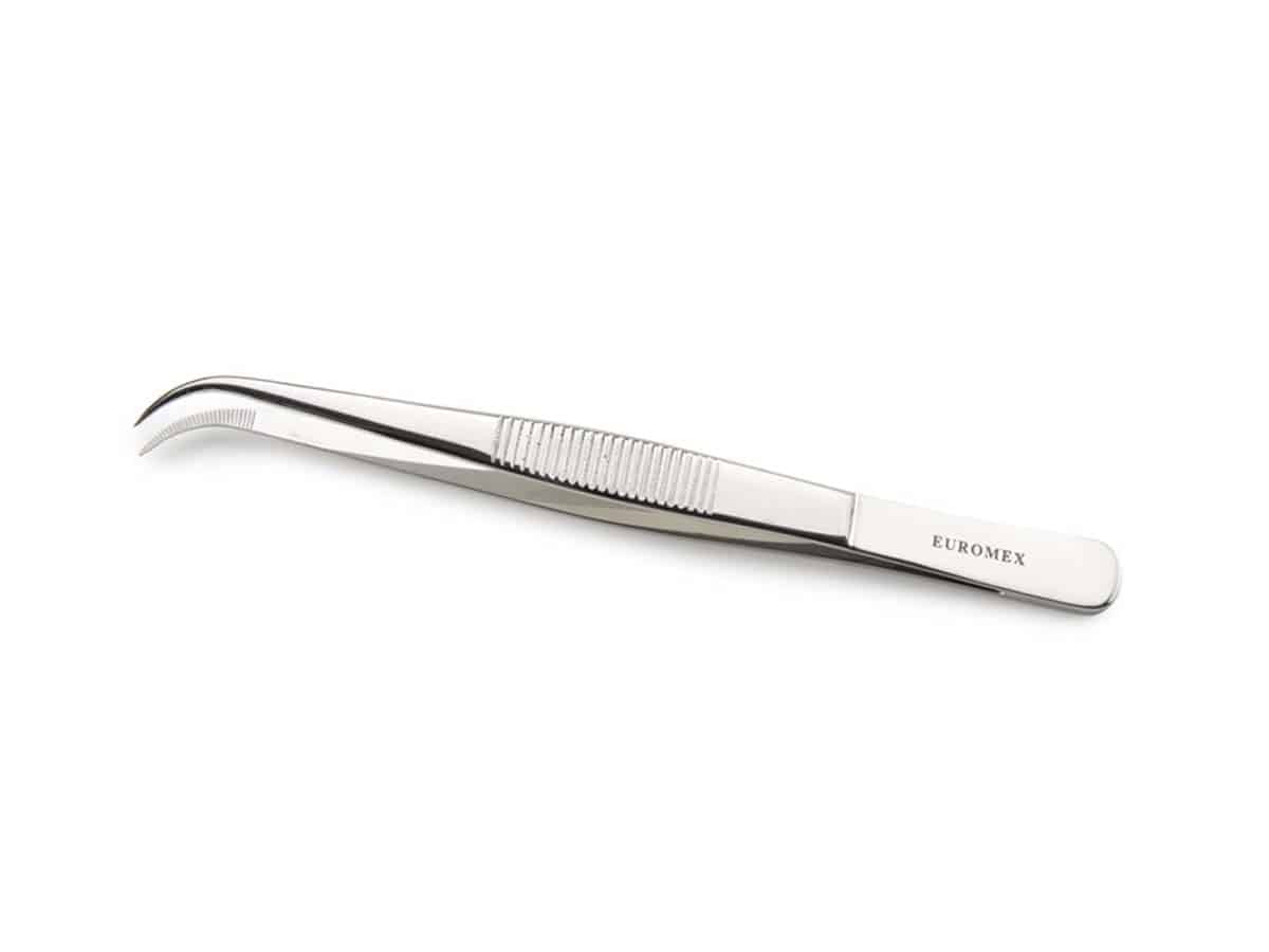 Mikroskopische Pinzette aus rostfreiem Stahl. Fein gebogene scharfe Spitzen, Edelstahlgriff, Länge: 130 mm
