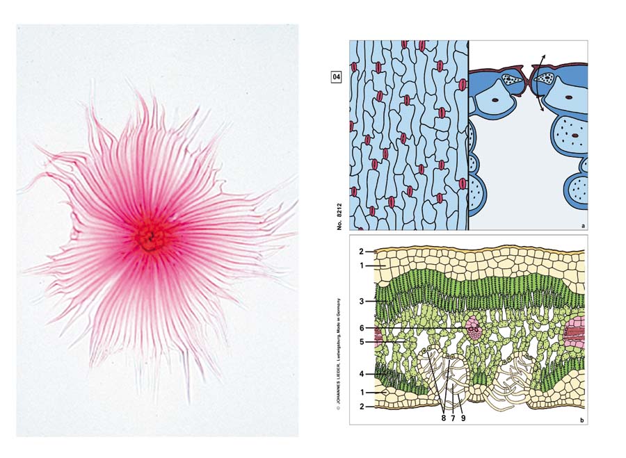 1. Mais, monokotyles Blatt vom Gramineentyp, quer. Blasenzellen – 2. Flieder, typisches dikoltyles Blatt, quer. Epidermis, Palisadenparenchrym, Schwammparenchrym, Leitbündel – 3. Blattepidermis von Tulipa, mit Spaltöffnungen und Schließzellen, total – 4. Wasserpest, Hydrophytenblatt quer. Blattspreite reduziert auf obere und untere Epidermis –