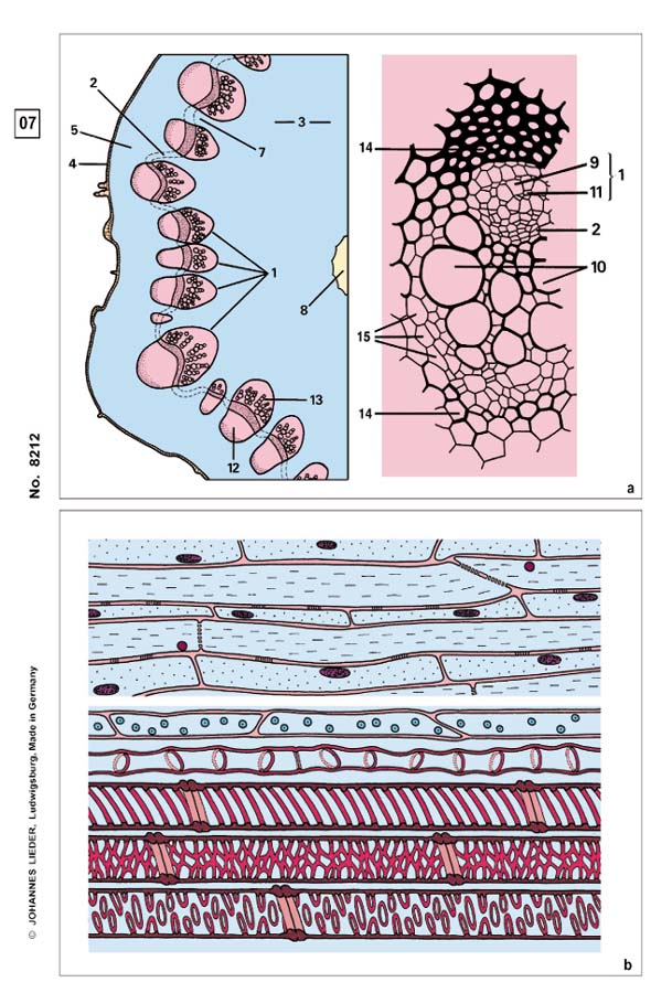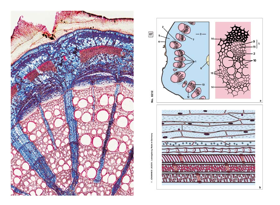 2. Sonnenblumen, typischer dikotyler Stamm, quer. Offene kollaterale Leitbündel – 3. Kürbis, Stamm mit Siebröhren und Gefäßen, längs – 4. Weizen, Stamm (Halm) einer Graminee quer. Zentrale Markhöhle, ringförmige Anordnung der Leitbündel – 5. Wasserpest, Stamm mit Aerenchym, quer. Reduziertes Leitbündel einer Wasserpflanze –