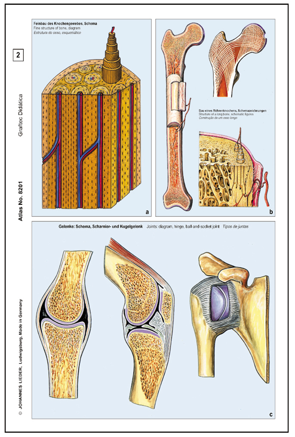 1. Einfache tierische Zellen mit Zellkern, Plasma und Zellgrenzen. Schnitt durch die Salamanderleber – 2. Plattenepithel, isolierte Zellen aus der Mundhöhle des Menschen – 3. Nervenzellen und -fasern im Rückenmark der Katze, quer. Übersichtspräparat – 4. Knochen vom Rind, kompakte Substanz, quer. Färbung der Knochenzellen und ihrer Ausläufer –