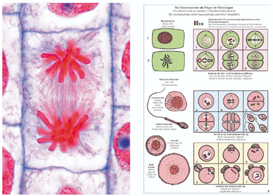 1. Zellteilungen (Mitosen). Wurzelspitzen von Allium, Küchenzwiebeln, längs. Alle Teilungsstadien. Färbung mit Eisenhämatoxylin – 2. Mitosen in der Keimscheibe eines Fisches, Schnitt. Zentrosphären – 3. Hoden der Maus, quer. Spermatogenese – 4. Riesen-chromosomen aus der Speicheldrüse der Chironomuslarve, Quetschpräparat, Spezial-