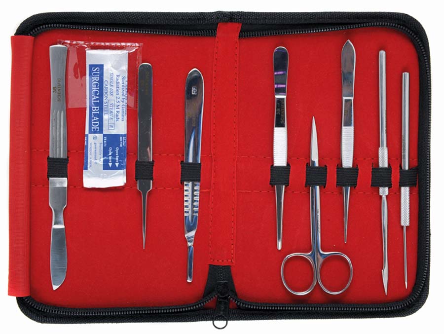 Umfangreiches Präparierbesteck in einem Kunstlederetui mit hochwertigen Edelstahlinstrumenten.