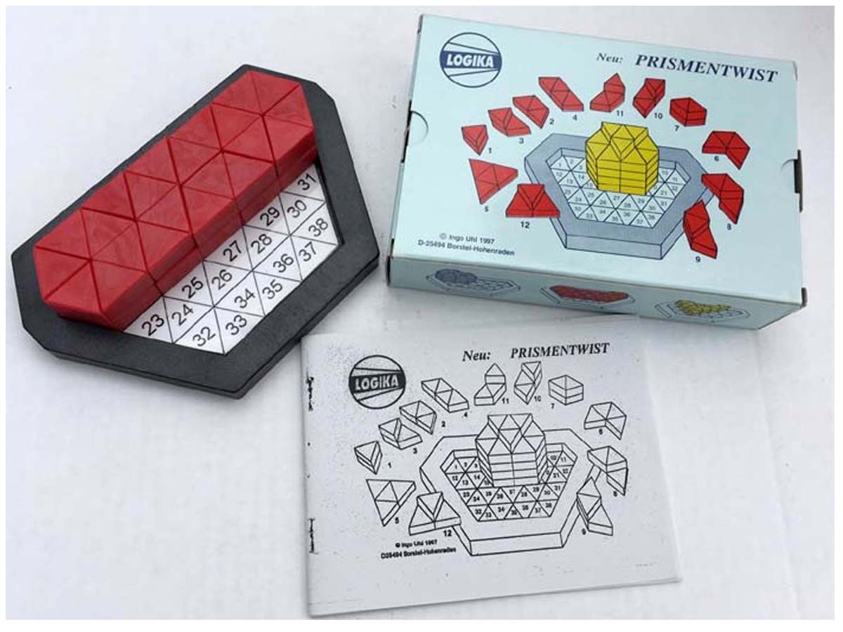 Das 3-D-Puzzle besteht aus 12 verschiedenen Bausteinen. Die Bausteine bestehen aus 2, 3 oder 4 Prismen. Die dazugehörige Basisplattform hat 38 dreieckige Felder und ist so gestaltet, dass viele verschiedene symmetrische dreidimensionale Baukörper erstellt werden können.