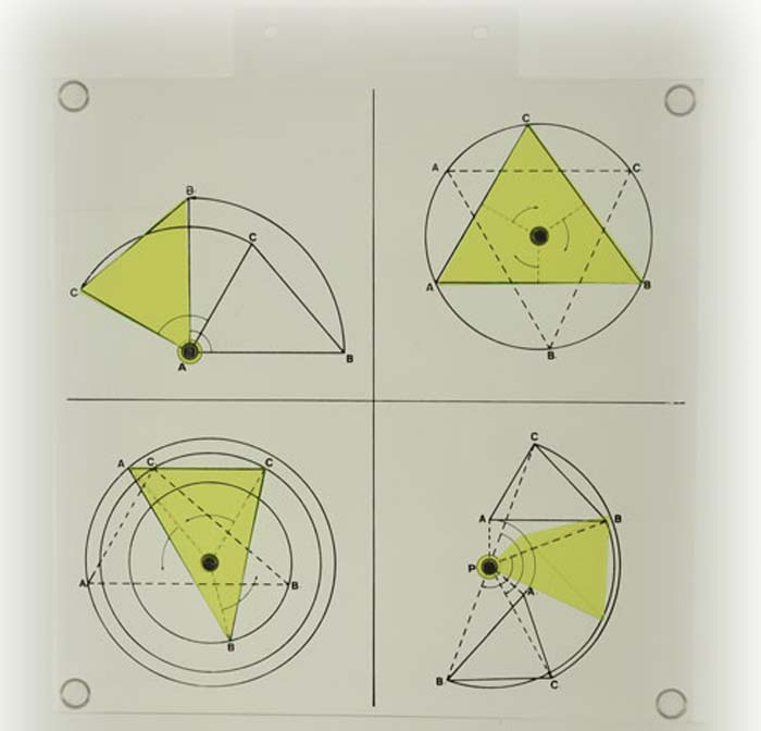 Projektionsmodell für die Drehung von Dreiecken und Geraden um einen beliebigem Winkel und mit unterschiedlichem Drehsinn.