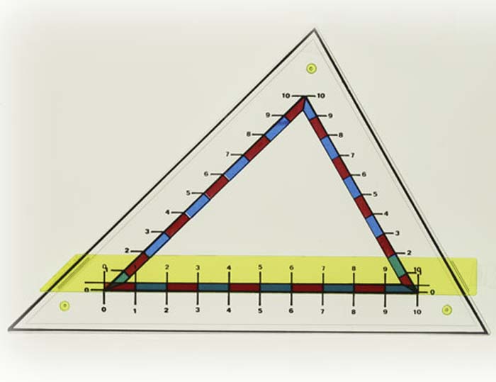 Dreieck mit parallel zur Grundlinie verschiebbarer Schiene und Zahlenteilung zum Einstellen und Vergleichen verschiedener Abschnitte.