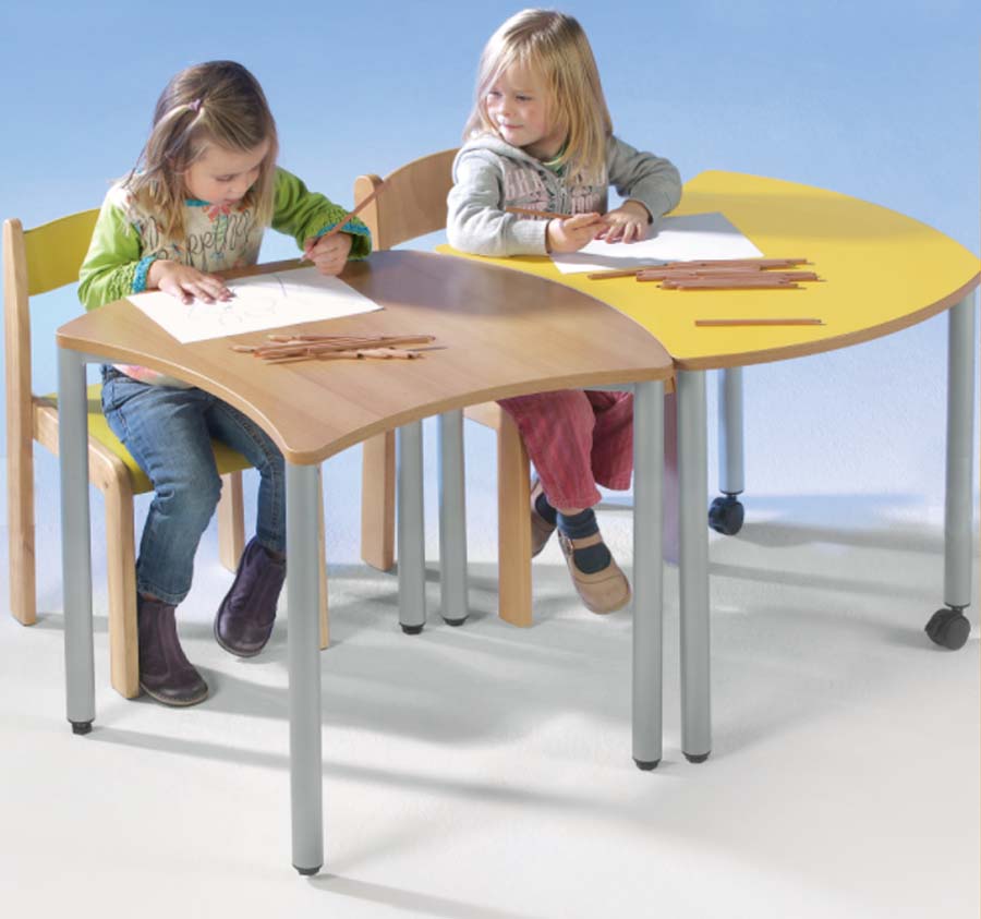 Wellentische mit einem leichten Stahlgestell aus 40 mm Rundrohr & einer Tischplatte aus melaminbeschichteter Spanplatte.