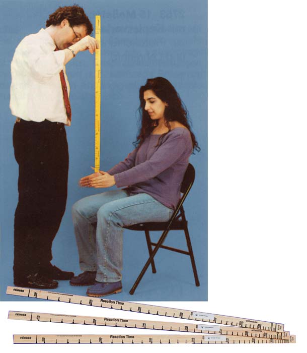 Der Reaktionszeit-Meßstab ist ein einfaches, aber zuverlässiges Meßgerät, mit welchem die Reaktionszeit einer Versuchsperson auf etwa 10 Millisekunden genau ermittelt werden kann.