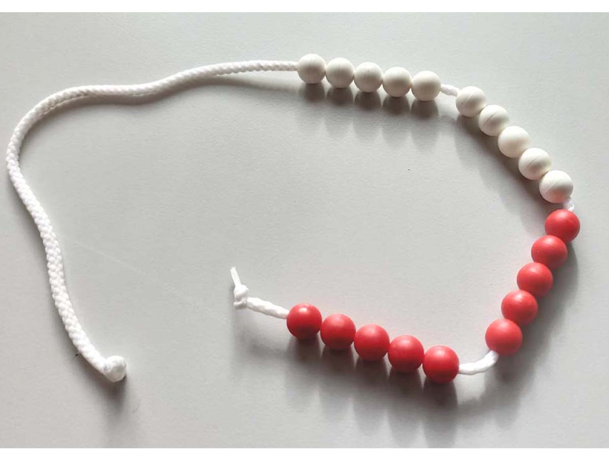 Kunststoffkugeln ca. 10 mm ø auf einer dehnbaren Schnur (Beim Ziehen der Schnur wird die leichte Kugelarretierung aufgehoben), 45 cm lang