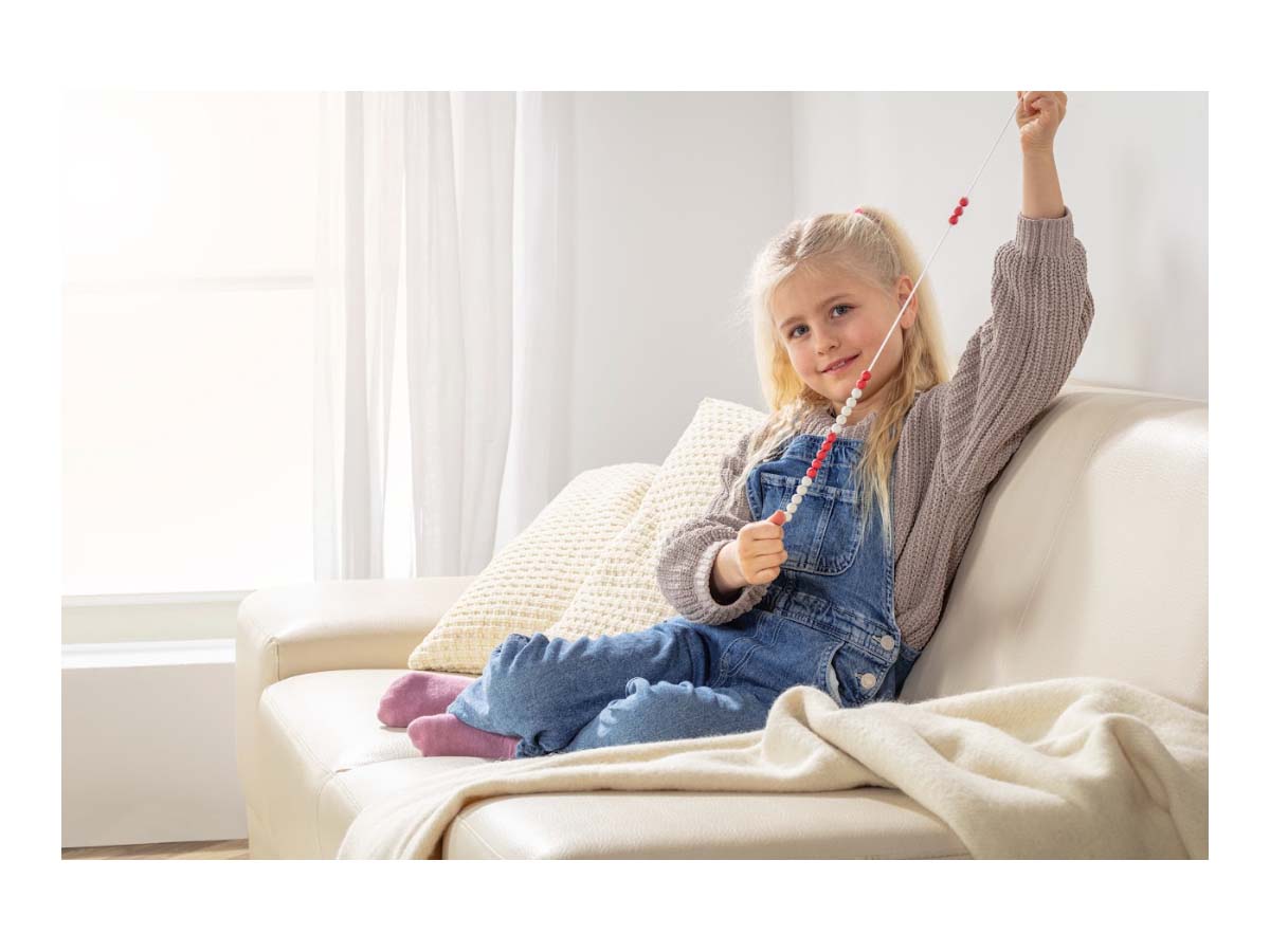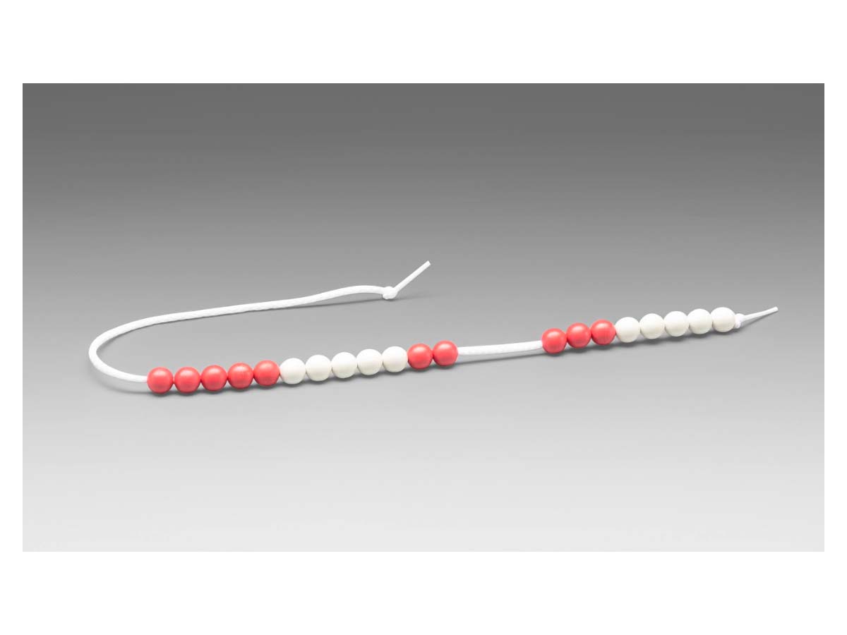 Rechenkette (ca. 45 cm) mit 20 Kugeln, die im 5er- Schritt auf einer reißfesten, dehnbaren Schnur aufgefädelt sind. Die Kugeln sind aus RE-Plastic und haben einen Durchmesser von 10 mm. Beim Ziehen der Schnur wird die leichte Kugelarretierung aufgehoben und alle Perlen rutschen wieder aneinander.