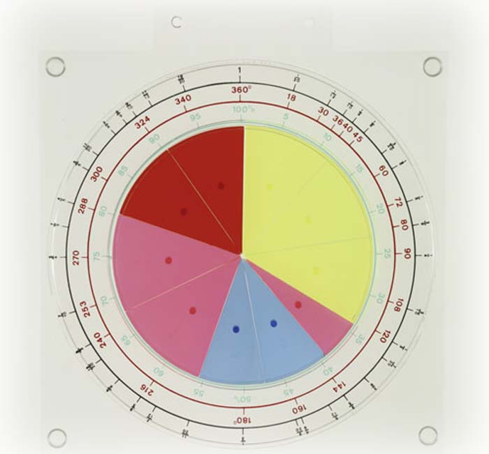 Rechenkreis mit auswechelbaren Kreisteilen und Skalen für die Darstellung von echten Brüchen, Prozentwerten, Winkelwerten und Kreisteilen.