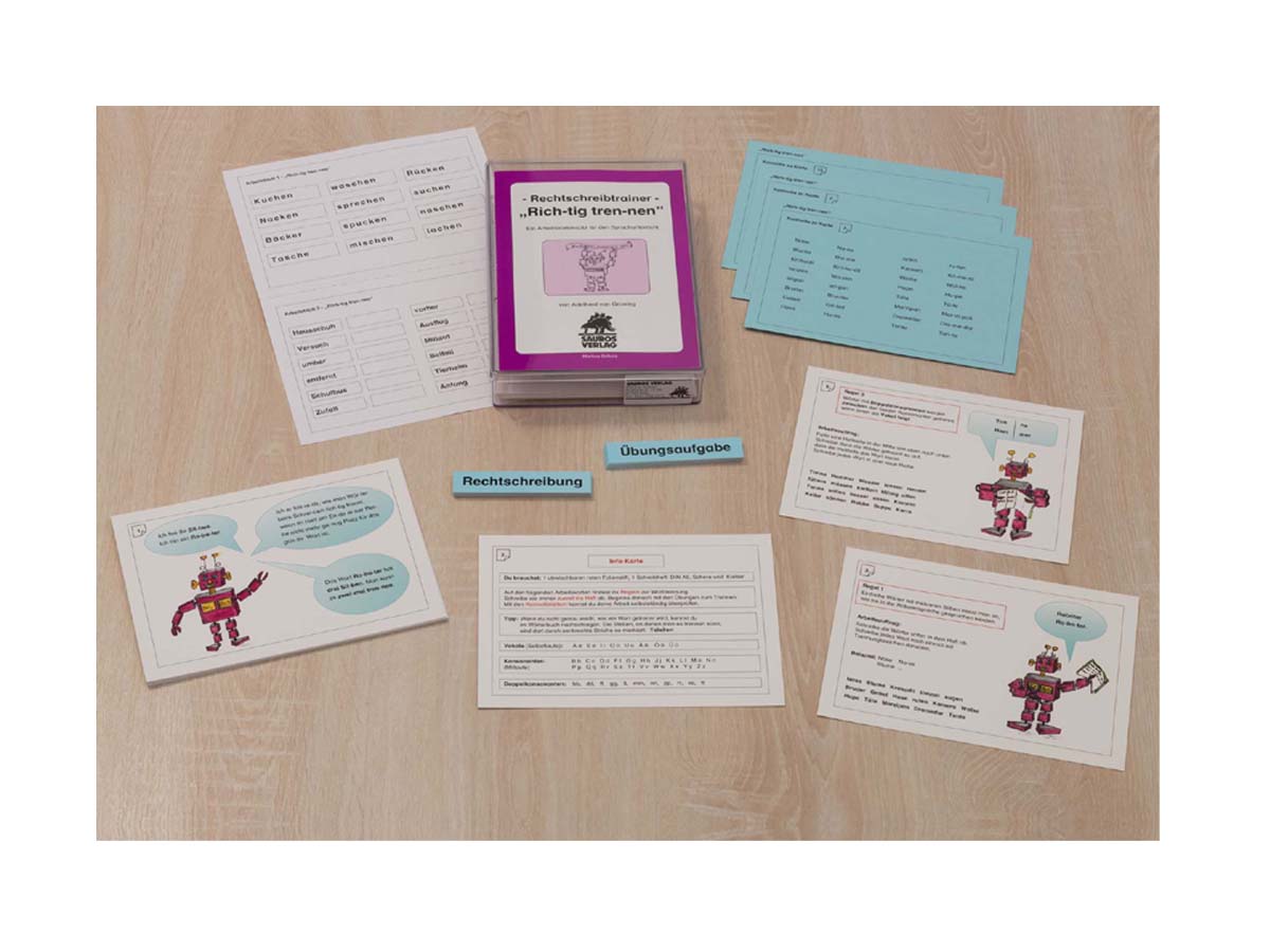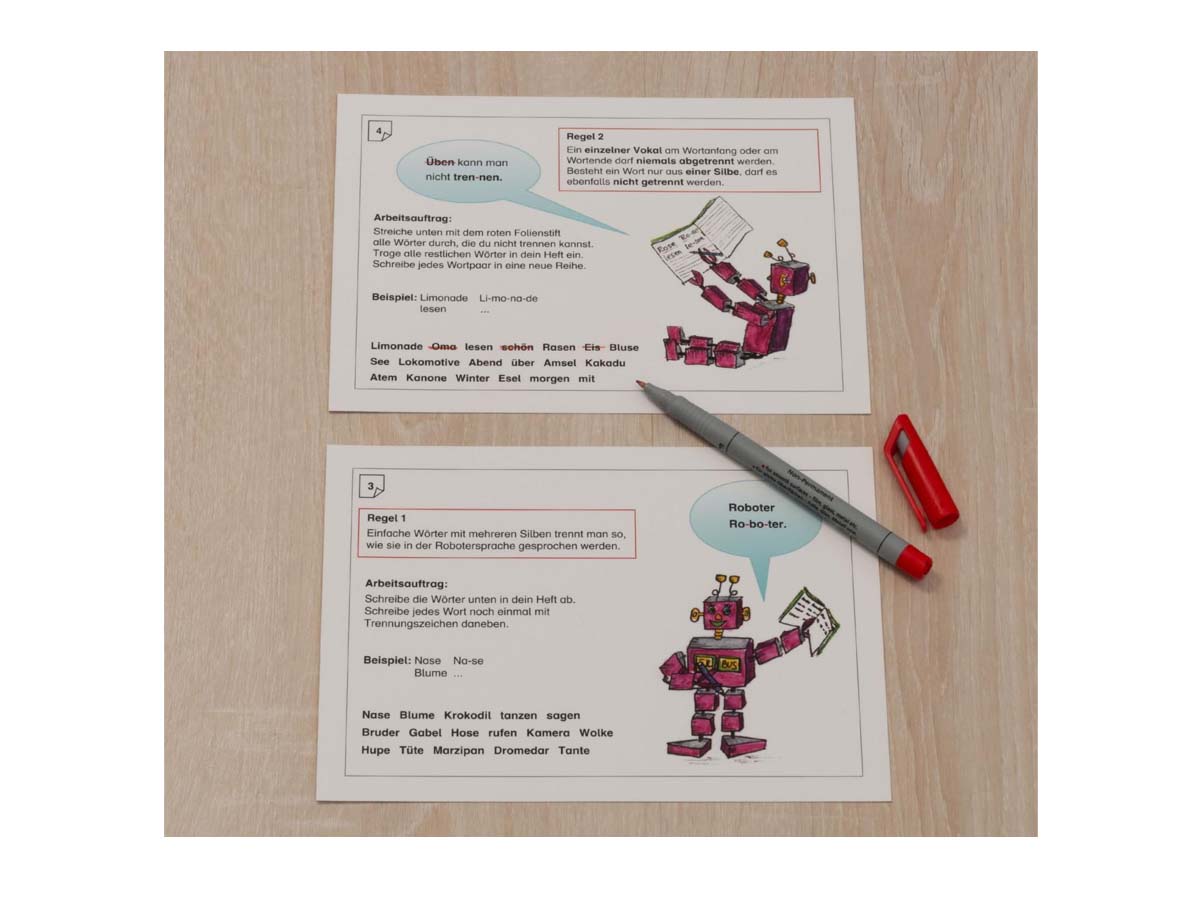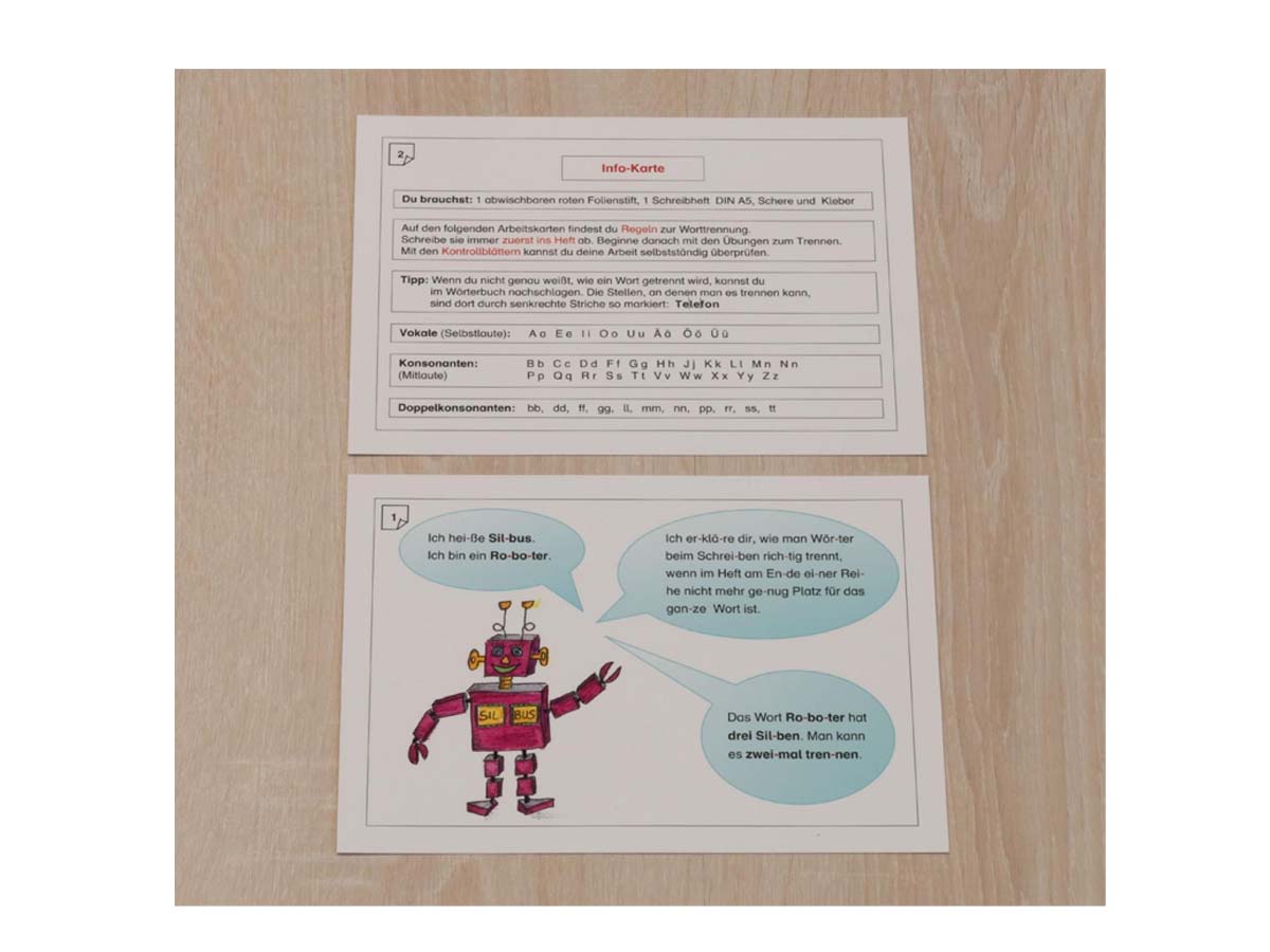Alle Karten sind beidseitig kaschiert. Der Roboter „Sil-bus“ begleitet die Kinder durch die Übungen zur Worttrennung. Die Ro-bo-ter-spra-che ist hilfreich, Kinder in das Rechtschreibthema Worttrennung einzuführen, weil sie das Grundprinzip der Trennung nach Sprechsilben verwendet. Die wichtigsten Regeln zur Worttrennung werden Karte für Karte eingeführt und mit Hilfe unterschiedlicher Methoden geübt.