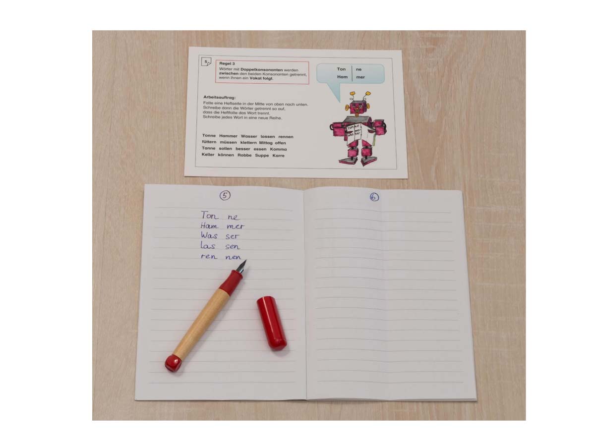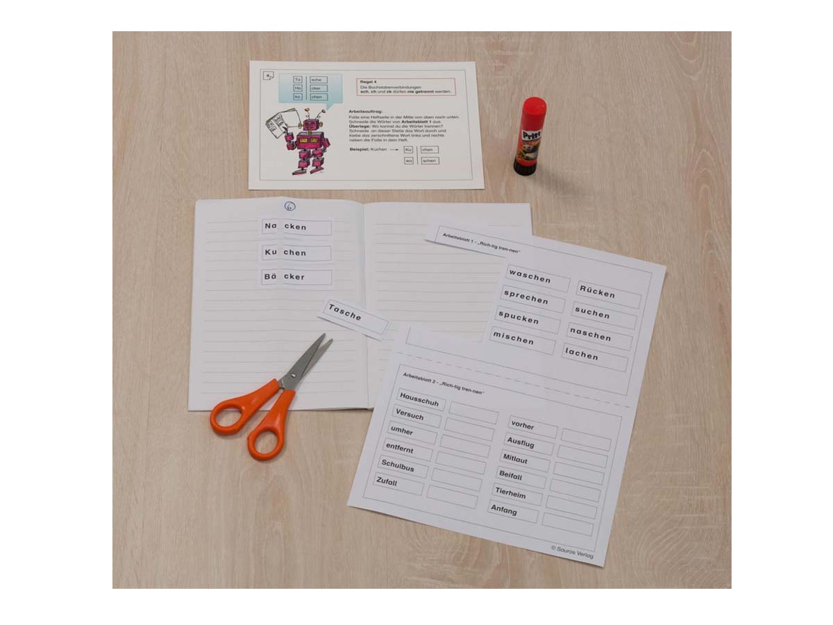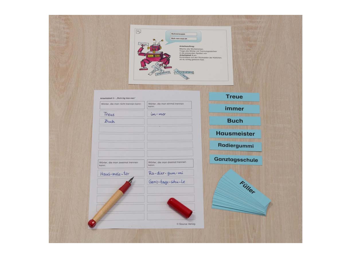Alle Karten sind beidseitig kaschiert. Der Roboter „Sil-bus“ begleitet die Kinder durch die Übungen zur Worttrennung. Die Ro-bo-ter-spra-che ist hilfreich, Kinder in das Rechtschreibthema Worttrennung einzuführen, weil sie das Grundprinzip der Trennung nach Sprechsilben verwendet. Die wichtigsten Regeln zur Worttrennung werden Karte für Karte eingeführt und mit Hilfe unterschiedlicher Methoden geübt.