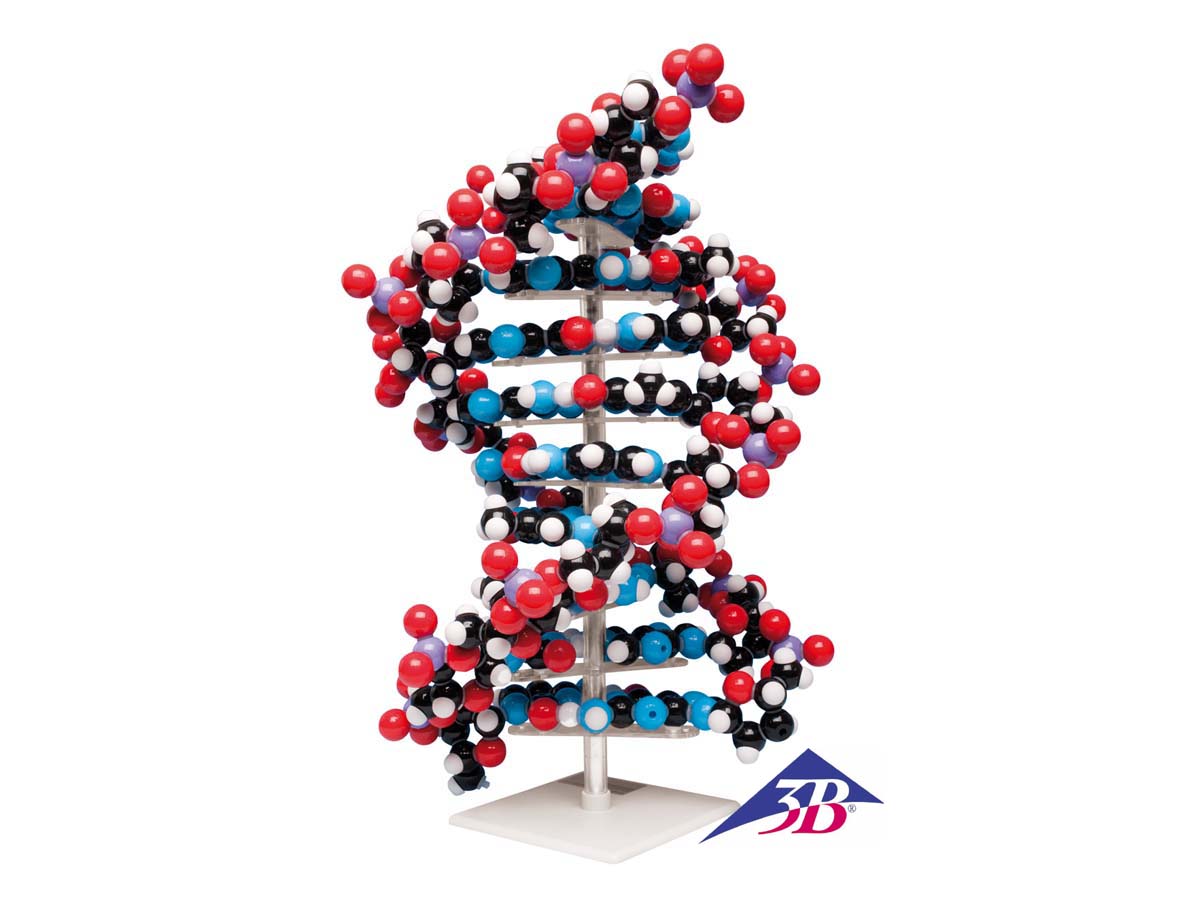 Modell einer Doppelhelix bestehend aus fünf zweischichtigen Modellen mit insgesamt 640 einzelnen Atomteilen.