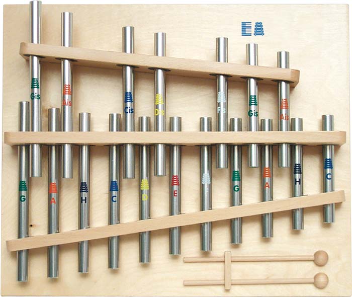 Chromatisches Röhrenxylophon, 18 Tonröhren aus Aluminium, g2 -c4 mit Halbtönen, 2 Holzkugelschlägel.