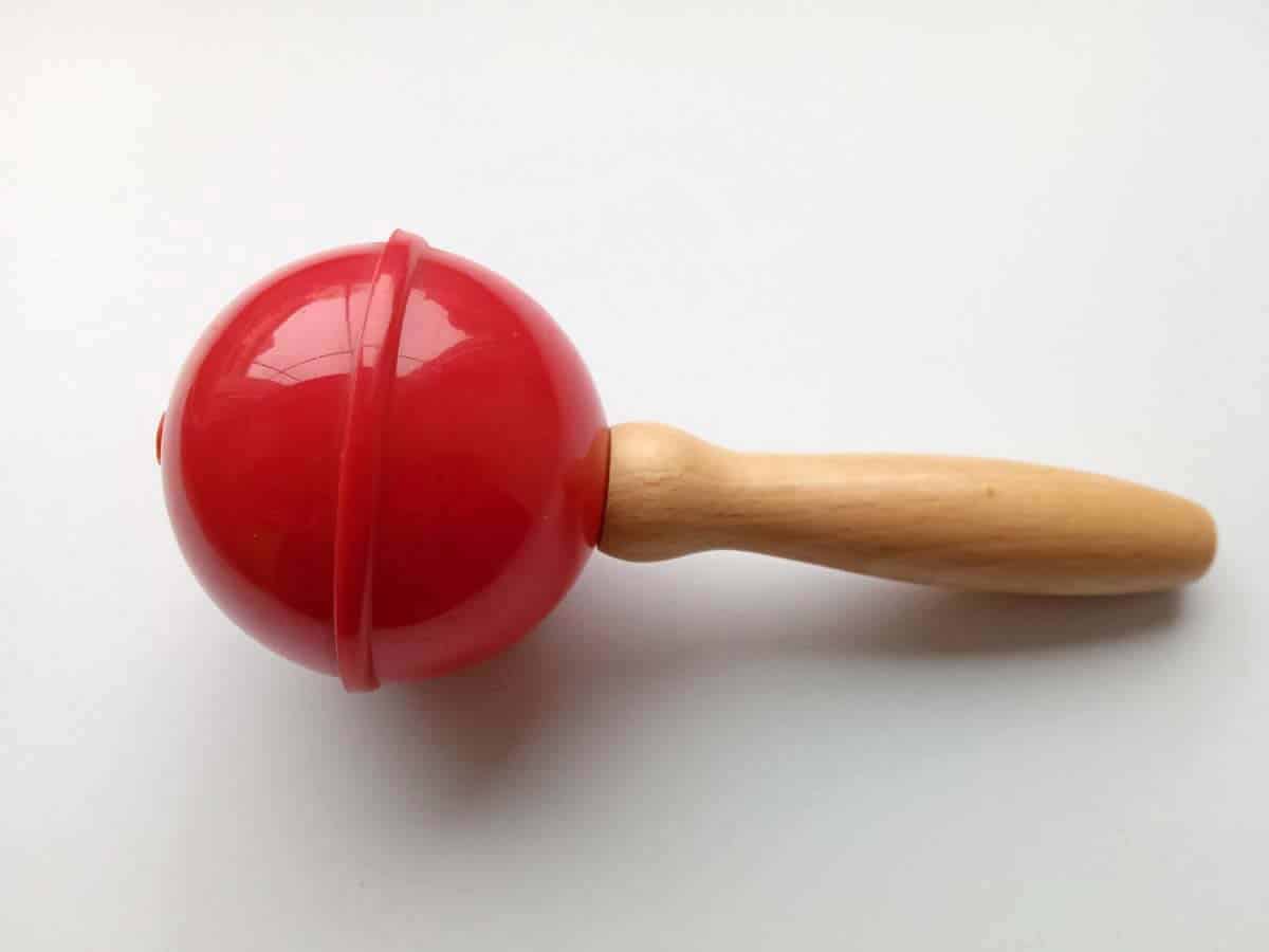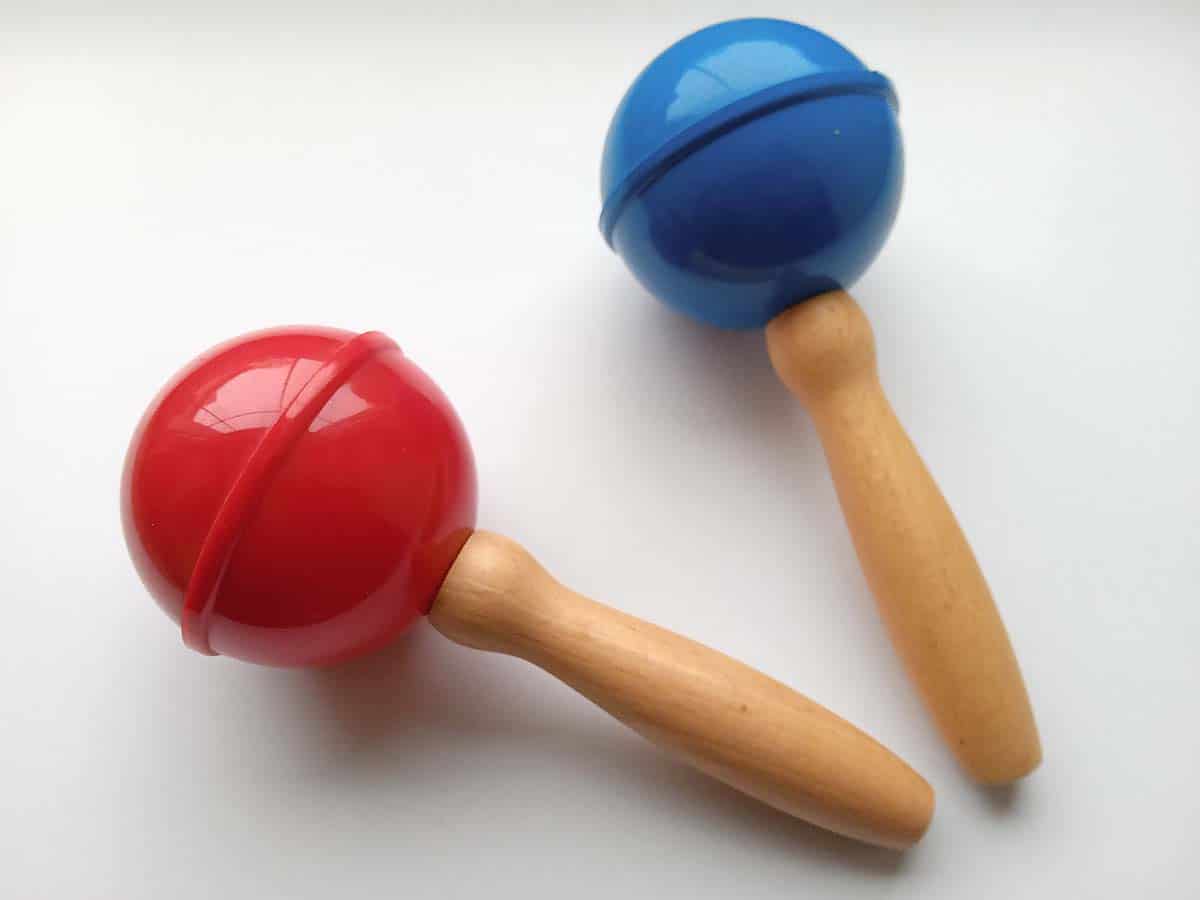 Rumbakugel aus hochwertigem Kunststoff (rot oder blau) mit Holzgriff. Garantiert einen unüberhörbaren Klang.