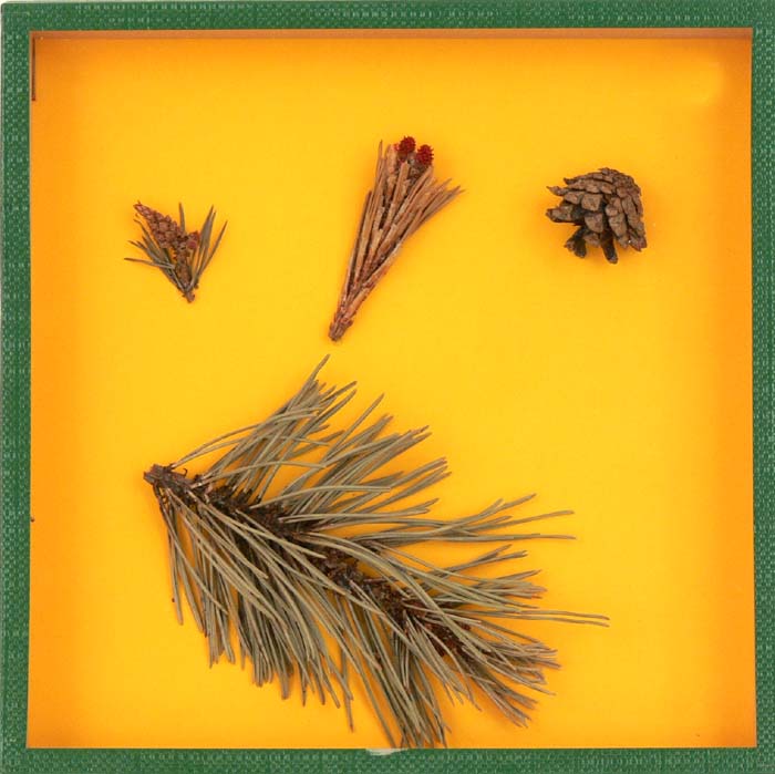 Natürliche Objekte,präpariert und montiert, männl. und weibl. Blüte, Zapfen, Zweig.